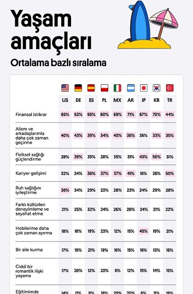 ABD, Almanya, İspanya, Polonya, Meksika, Arjantin, Japonya, Güney Kore ve Türkiye’den 5 bin 400’ü aşkın katılımcıyla yürütülen araştırmada katılımcıların çoğu, hayattan en önemli beklentilerinin finansal istikrar olduğunu ifade etti. Türkiye’deki katılımcılar ise, Z ve Y kuşağı fark etmeksizin, en önemli önceliklerinin kariyer olduğunu vurguladı. Küresel çapta milenyum kuşağının yüzde 64’ü finansal istikrarı en önemli beklentisi olarak sayarken, Z kuşağının yüzde 59’u ilk sıraya finansal istikrarı yazdı. Finansal istikrar ve kariyer başlıklarını, aile ve arkadaşlarla daha çok vakit geçirme ve fiziksel sağlık izledi.