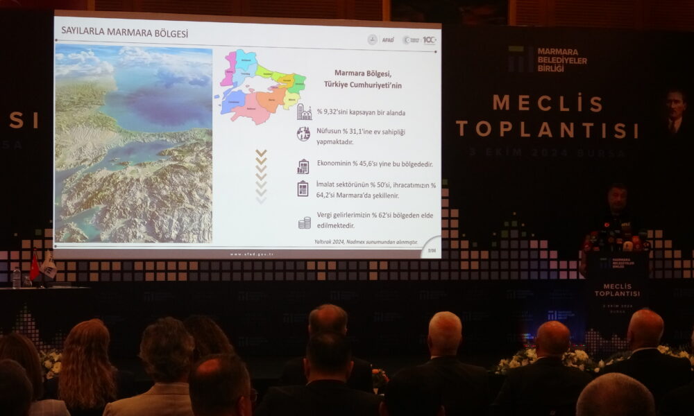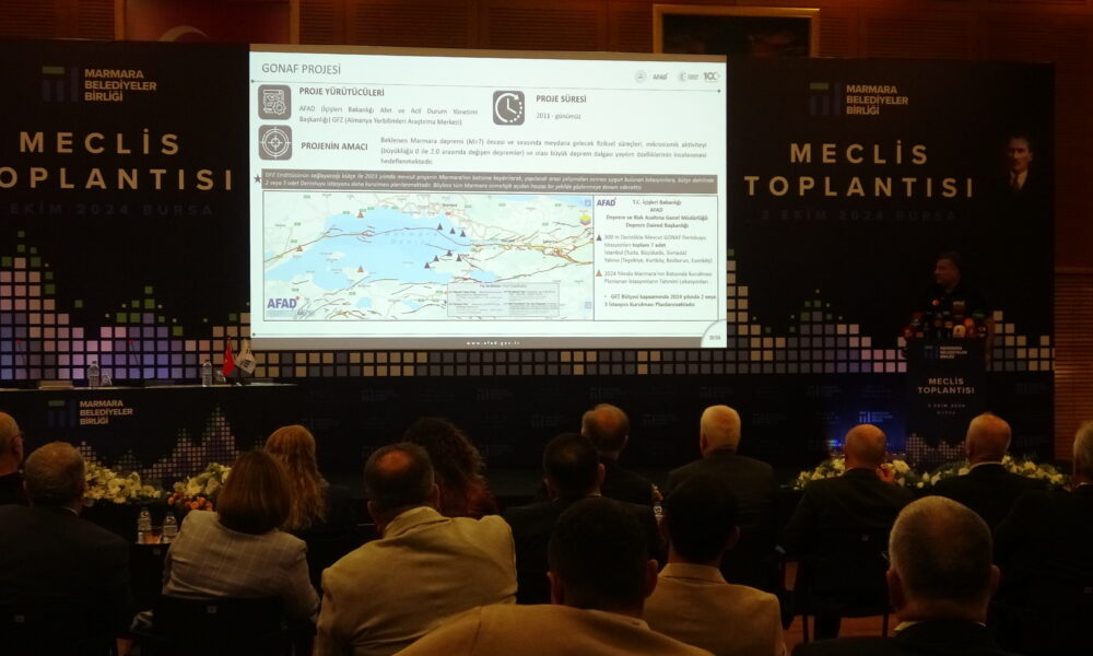 Bursa Büyükşehir Belediye Başkanı Mustafa Bozbeyin başkanlığını yaptığı Marmara Belediyeler Birliği 2’nci Meclis Toplantısı, Merinos Atatürk Kongre ve Kültür Merkezi (AKKM) Hüdavendigar Salonu’nda yapıldı. AFAD Deprem ve Risk Azaltma Genel Müdürü Prof. Dr. Orhan Tatar, Marmara Afet Risklerini Azaltma Daire Başkanı Gökhan Yılmaz ve belediye başkanlarının katıldığı toplantıda Marmara Bölgesi’nin afet yönetimi konusu ele alındı. 250 yıldır enerji toplayan Marmara fayının 7.8lik deprem üretebileceğini söyleyen AFAD Deprem ve Risk Azaltma Genel Müdürü Prof. Dr. Orhan Tatar, “1999 İzmit Depremi ile 1912 Mürefte (Şarköy) depremleri arasındaki alan henüz kırılmadı. Tek bir kerede mi yoksa birkaç parça şeklinde mi kırılır, bunun hiçbir anlamı yok. Sonuçta enerji biriktirmiş durumda ve günün birinde kırılacak. Her yıl 2,5 santimetre enerji biriktiriyor, her yıl 2,5 santimetre batıya doğru hareket ediyor. Bu fayın elastik payı tükendiği anda kırılacak. Burada baktığımızda 250 yıllık birikim var. Bugüne kadar 6 ila 7 metre arasında yer değiştirmesi söz konusu. Hatırlarsanız 17 Ağustos’ta, demir yolundaki rayların bükülmesi bu şekilde oldu. Bu hangi büyüklükteki depreme karşılık derseniz, kırılmanın mekanizmasına göre 7.2’den başlayıp 7.8’e kadar çıkabilecek büyüklükte bir deprem üretebilir diye konuştu.