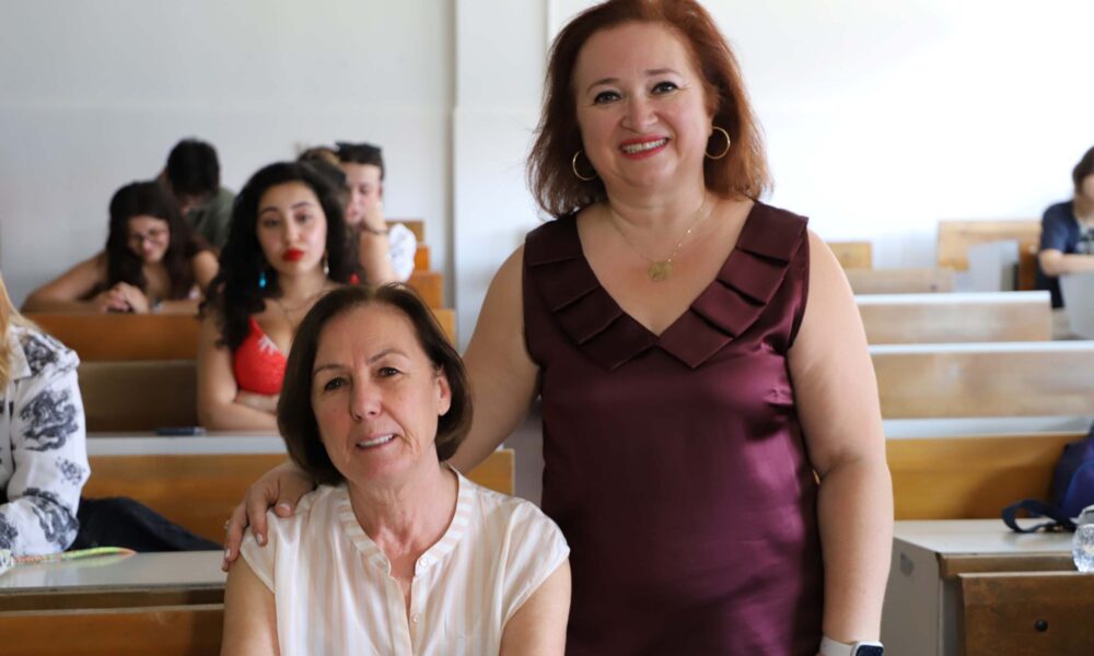 EÜ Eczacılık Fakültesi Farmakoloji Anabilim Dalı'nda 40 yıl öğretim üyeliği yapan Prof. Dr. Zeliha Kerry (solda), EÜ Sosyoloji Bölümü'ne öğrenci olarak kaydoldu. İlknur Aydoğdu (sağda). Fotoğraf: Seza Nur ALPDÜNDAR/İzmir,(DHA)