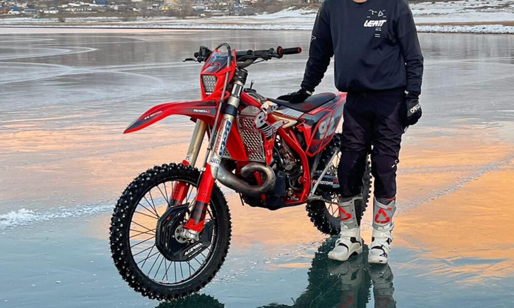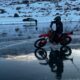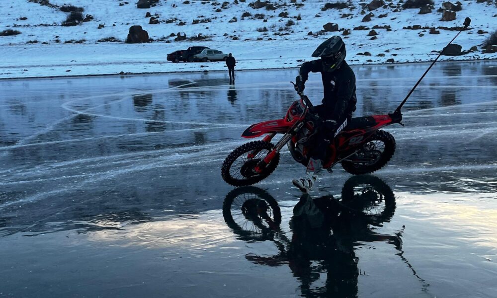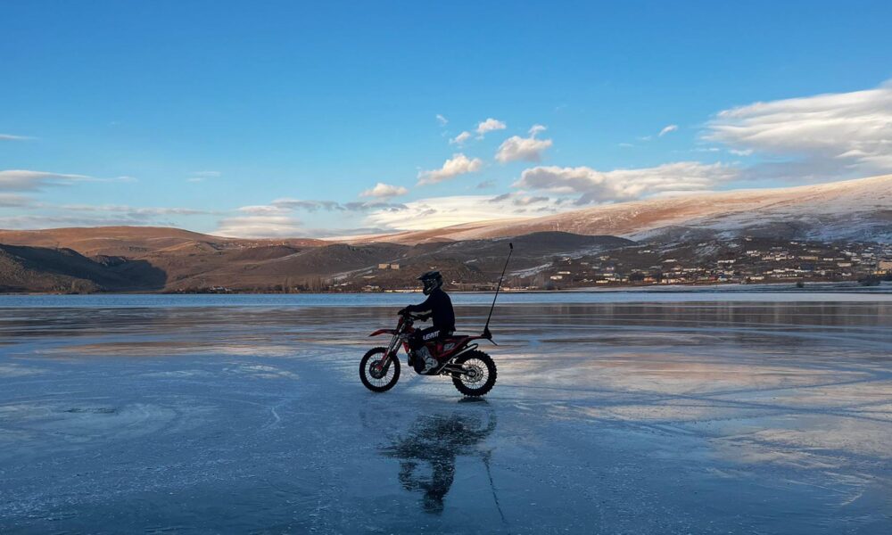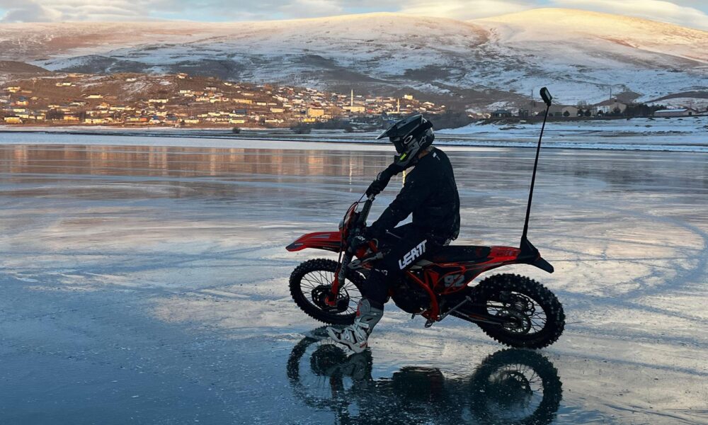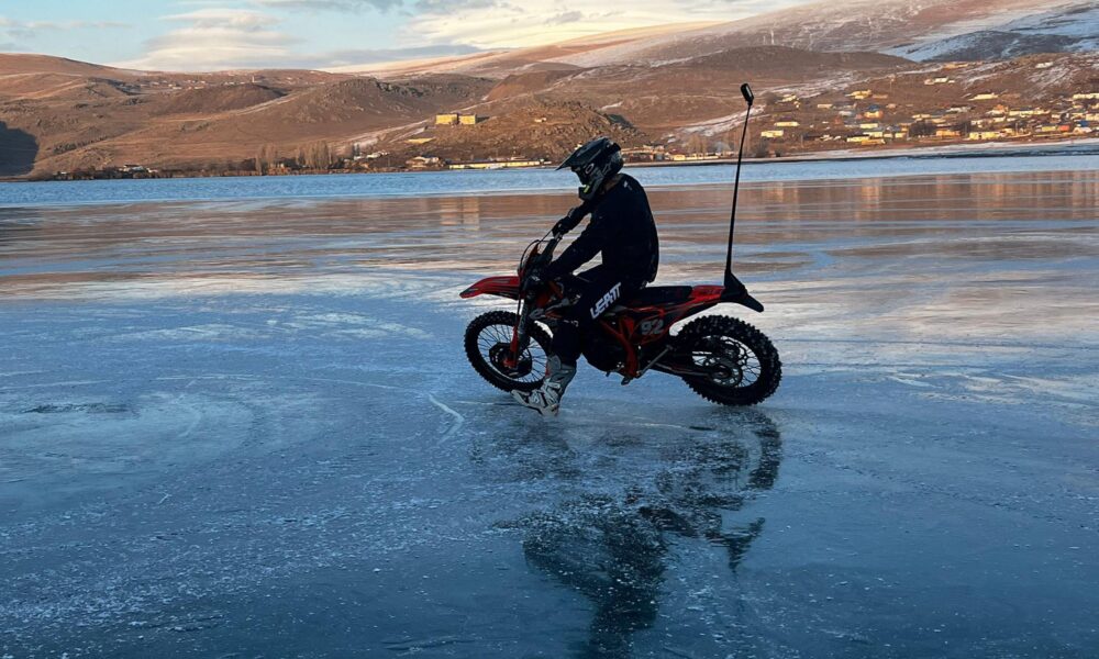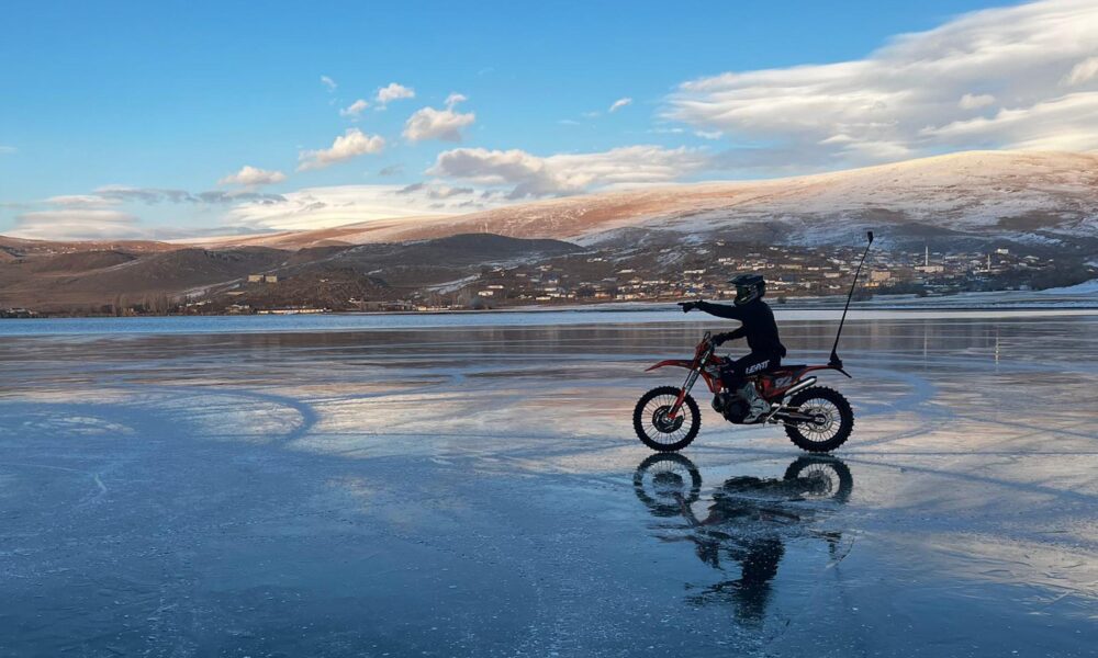 Profesyonel motosikletçi Atlı’dan Çıldır Gölü’nde buz üstünde drift şov