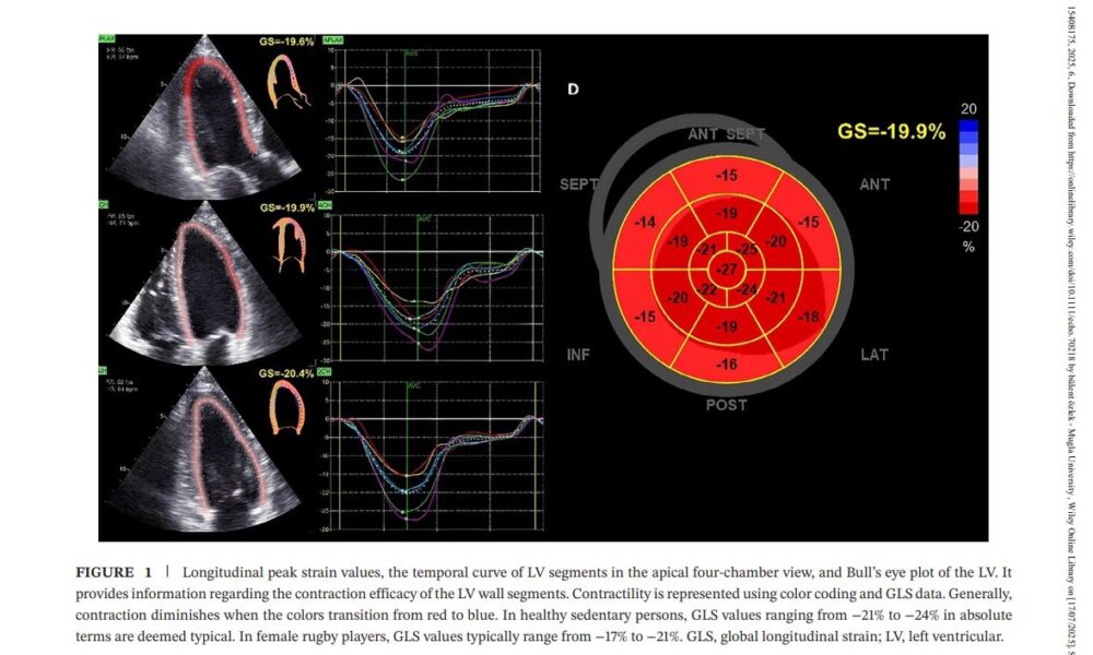 Ankara Etlik Şehir Hastanesinde yapılan araştırmada, 2023 Türkiye Kadınlar Ragbi 7li Şampiyonasına katılan 66 kadın oyuncu ile 50 fiziksel aktivitesi hiç olmayan ya da düzensiz yaşam (setander yaşam) tarzına sahip kadın karşılaştırıldı. Kadın ragbi oyuncuların kalpleri, ultrasonla görüntülenerek incelenirken, özellikle kalp kasının gizli düzeydeki fonksiyonunu ölçen veriler değerlendirildi. Çalışmada ragbi oyuncuların kalp duvarı kalınlığı, ventrikül çapları ve sol atriyum boyutlarının anlamlı derecede büyüdüğü tespit edildi. Kalbin genel pompalama gücünü gösteren değeri normal kalmasına rağmen, kalp kası ölçümlerinde belirgin düşüş izlendi. Ragbi oynayan kadınlar grubunda ortalama GLS değeri (Kalbin kasılma gücünü ölçen değer) yüzde 19,9 iken, sedanter grupta yüzde 23 olarak belirlendi. Uluslararası tanınırlığı bulunan Echocardiography dergisinde geçen ay yayımlanan çalışma, yılın araştırma ödülüne aday gösterildi.