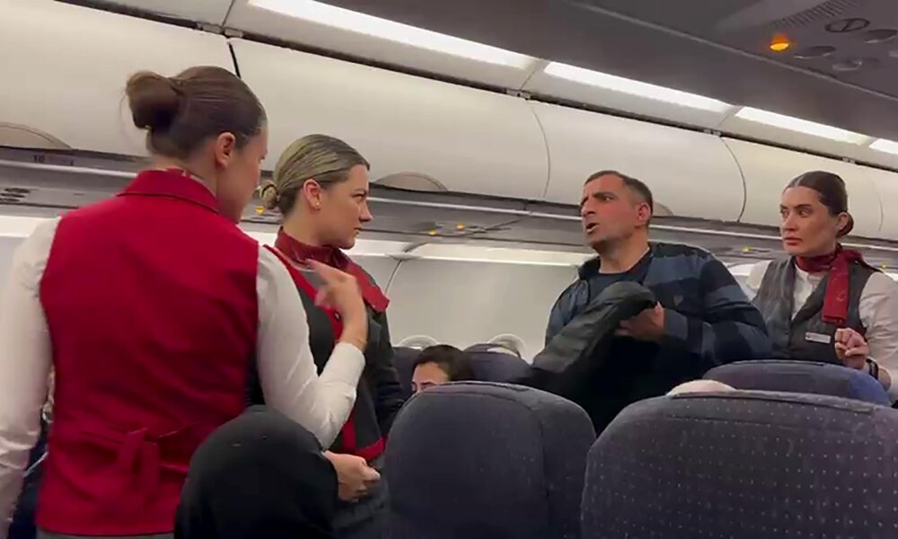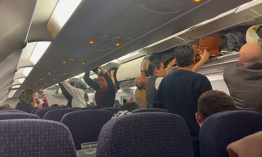 • Erzurum’dan İstanbul’a gitmek üzere havalanmak için hazırlanan uçakta bir kişi (koridorda ayakta) rahatsızlandı. Hosteslerin yardımıyla uçaktan indirilen yolcu, diğer yolculardan helallik istedi. Fotoğraf: Erzurum (DHA)