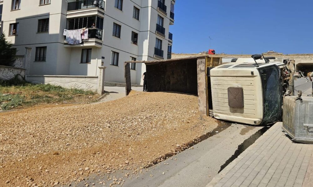 Rampa çıkarken geri kayan kamyon site duvarına çarpıp devrildi; atlayan sürücü yaralandı