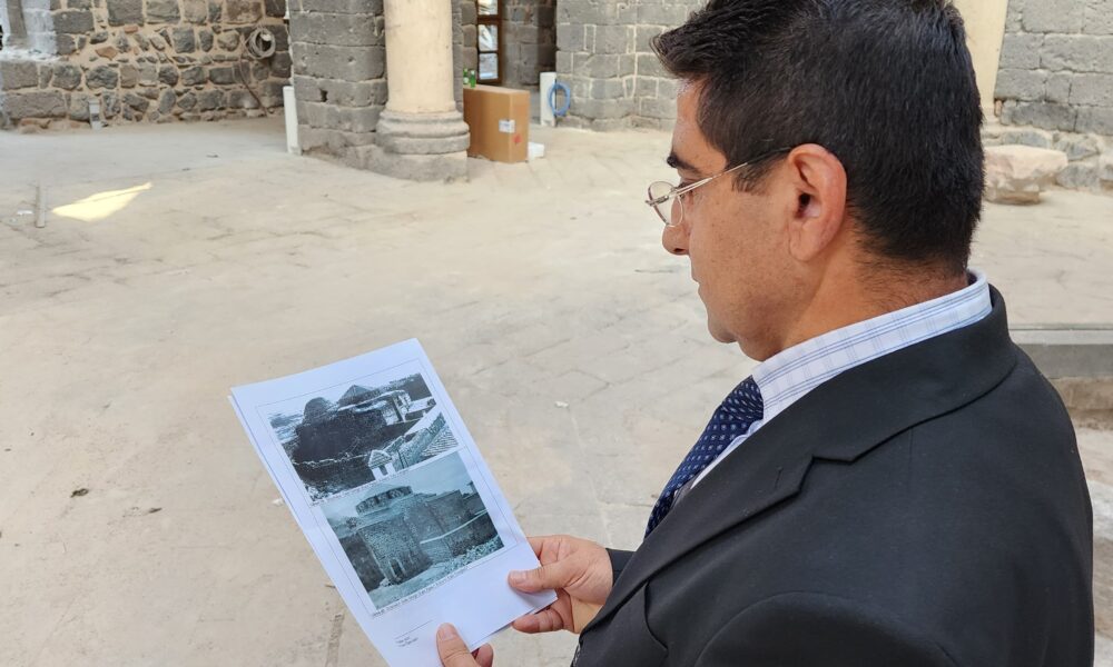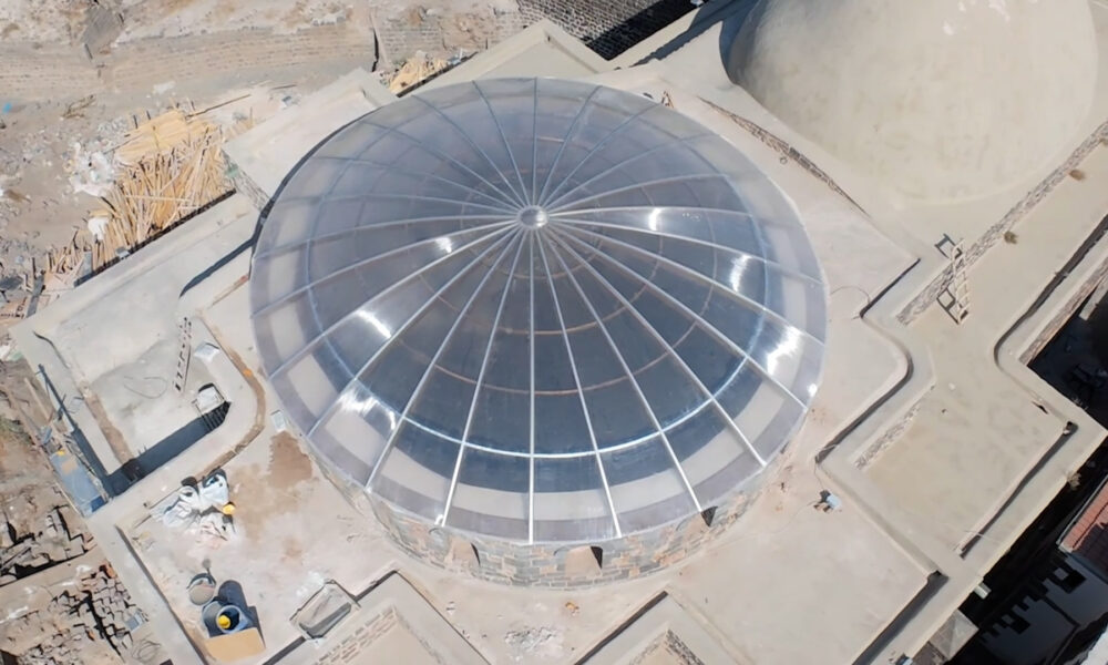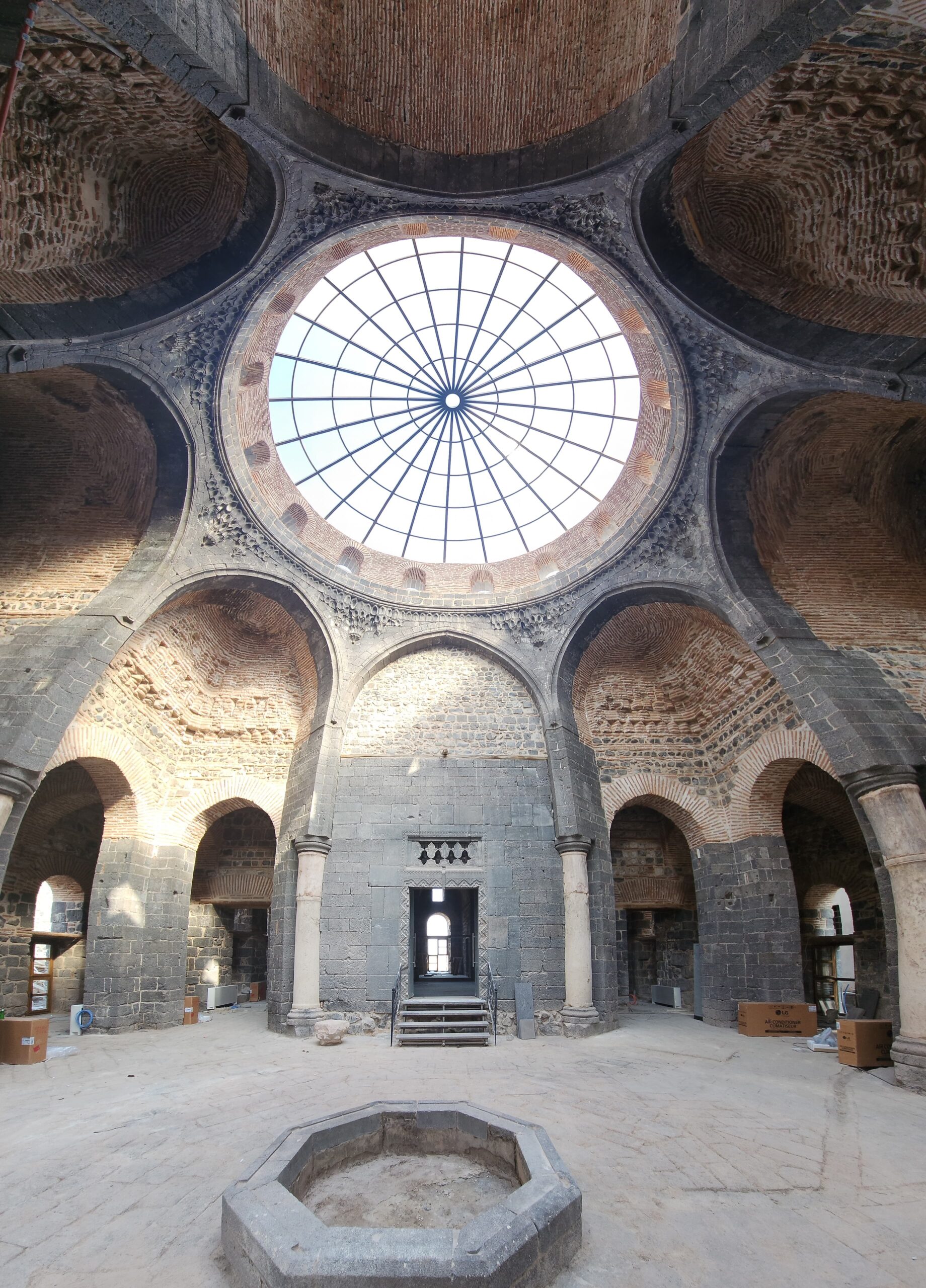 • Kahramanmaraş merkezli depremlerde ağır hasar aldıktan sonra restore edilmeye başlanan Diyarbakır'daki 1600 yıllık Saint George Kilisesi'nin yaklaşık 100 yıldır olmayan kubbesi, yenisi hazırlanarak vinçle yerleştirildi. Fotoğraf: Diyarbakır, (DHA)