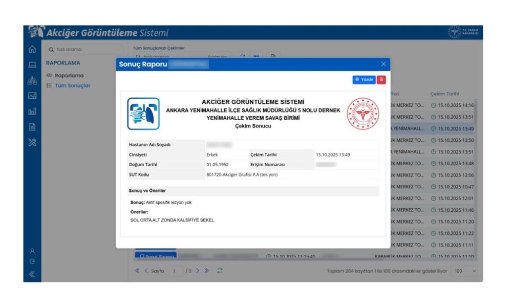 171 verem savaş dispanserini bu sisteme entegre ettiklerini belirten Genel Müdür Sezer, “Projenin hayata geçirildiği günden bu yana yaklaşık 8 bin akciğer grafisi sisteme kaydedildi. Ülke genelindeki dispanserlerimizde elde edilen akciğer görüntülerini tek bir ulusal altyapı üzerinde topluyor, güvenli biçimde arşivliyoruz. Bu görüntüler gerektiğinde hekimlerimiz tarafından uzaktan değerlendirilebiliyor. Böylece hem tanı süreçlerinde standartlaşmayı sağlıyoruz hem de hastalık verilerini bölgesel ve ulusal ölçekte anlık olarak izleyebiliyoruz. Yeni kurduğumuz sistemle; görüntülerin tüm merkezlerden erişilebilir hale getirilmesi ile tanı ve tedavi süreçlerini hızlandırdık ve süreçlerin dijital hale getirilmesi sayesinde çok önemli kazanımlar elde ettik” ifadelerini kullandı.