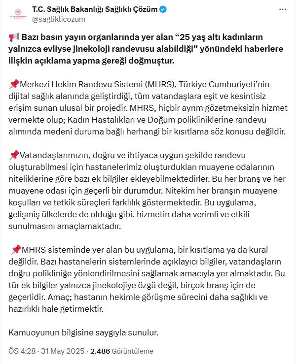 Bakanlığın Sağlıklı Çözüm adlı sosyal medya hesabından yapılan açıklamada, “Bazı basın yayın organlarında yer alan 25 yaş altı kadınların yalnızca evliyse jinekoloji randevusu alabildiği yönündeki haberlere ilişkin açıklama yapma gereği doğmuştur. Merkezi Hekim Randevu Sistemi, Türkiye Cumhuriyetinin dijital sağlık alanında geliştirdiği, tüm vatandaşlara eşit ve kesintisiz erişim sunan ulusal bir projedir. MHRS, hiçbir ayrım gözetmeksizin hizmet vermekte olup; kadın hastalıkları ve doğum polikliniklerine randevu alımında medeni duruma bağlı herhangi bir kısıtlama söz konusu değildir. Vatandaşlarımızın, doğru ve ihtiyaca uygun şekilde randevu oluşturabilmesi için hastanelerimiz oluşturdukları muayene odalarının niteliklerine göre bazı ek bilgiler ekleyebilmektedirler. Bu her branş ve her muayene odası için geçerli bir durumdur. Nitekim her branşın muayene koşulları ve tetkik süreçleri farklılık göstermektedir. Bu uygulama, gelişmiş ülkelerde de olduğu gibi, hizmetin daha verimli ve etkili sunulmasını amaçlamaktadır. MHRS sisteminde yer alan bu uygulama, bir kısıtlama ya da kural değildir. Bazı hastanelerin sistemlerinde açıklayıcı bilgiler, vatandaşların doğru polikliniğe yönlendirilmesini sağlamak amacıyla yer almaktadır. Bu tür ek bilgiler yalnızca jinekolojiye özgü değil, birçok branş için de geçerlidir. Amaç; hastanın hekimle görüşme sürecini daha sağlıklı ve hazırlıklı hale getirmektir” denildi.