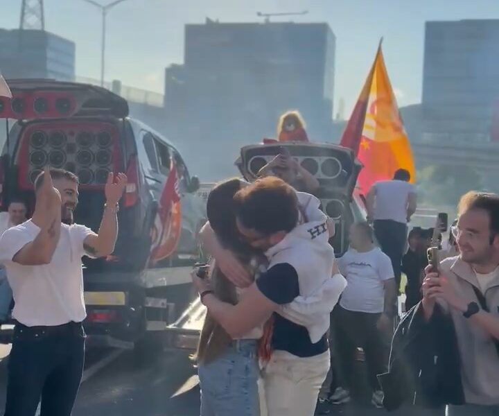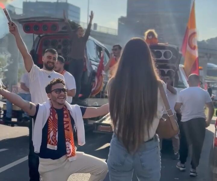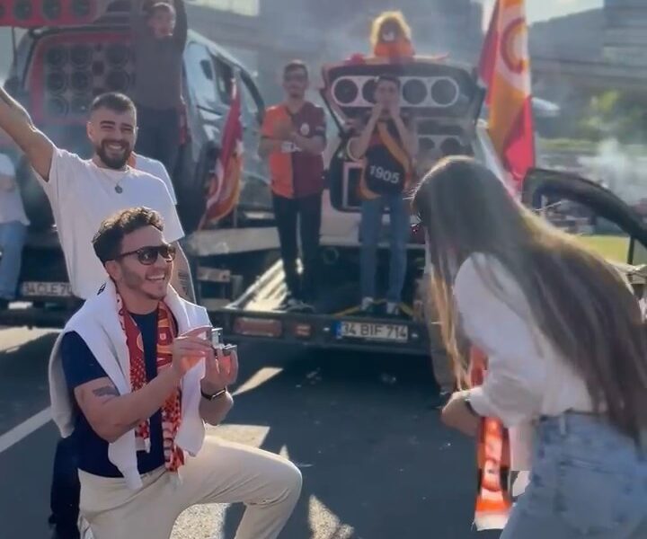 Galatasaray’ın dün akşam 25’inci şampiyonluğunu ilan etmesinin ardından yapılan kutlamalar için bugün Zonguldak’tan bazı taraftarlar İstanbul’a gitti. Kutlamalara giden Özgür Kahveci ve Fulya Yılmaz çifti, şampiyonluk kutlamalarını evlilik teklifi ile taçlandırdı. Rams Park’ta Kahveci, sevgilisi Fulya Yılmaz’a şarkılar eşliğinde evlilik teklifi etti. Yılmaz’ın ‘evet’ cevabıyla çift, birbirine sarılarak sevinç yaşadı. O anları, kutlamalarda bulunan bir başka taraftar cep telefonu kamerası ile görüntüledi.