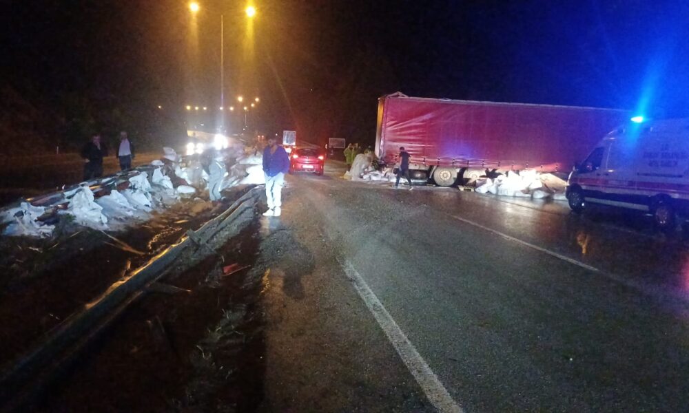 İhbar üzerine olay yerine polis ve jandarma ekipleri sevk edildi. Kazada, yaralanan olmadı. Yolun 2 şeridi ulaşıma kapanırken, trafik akışı tek şeritten sağlandı. TIR’ın kara yolundan kaldırılması için ise çalışma başlatıldı.