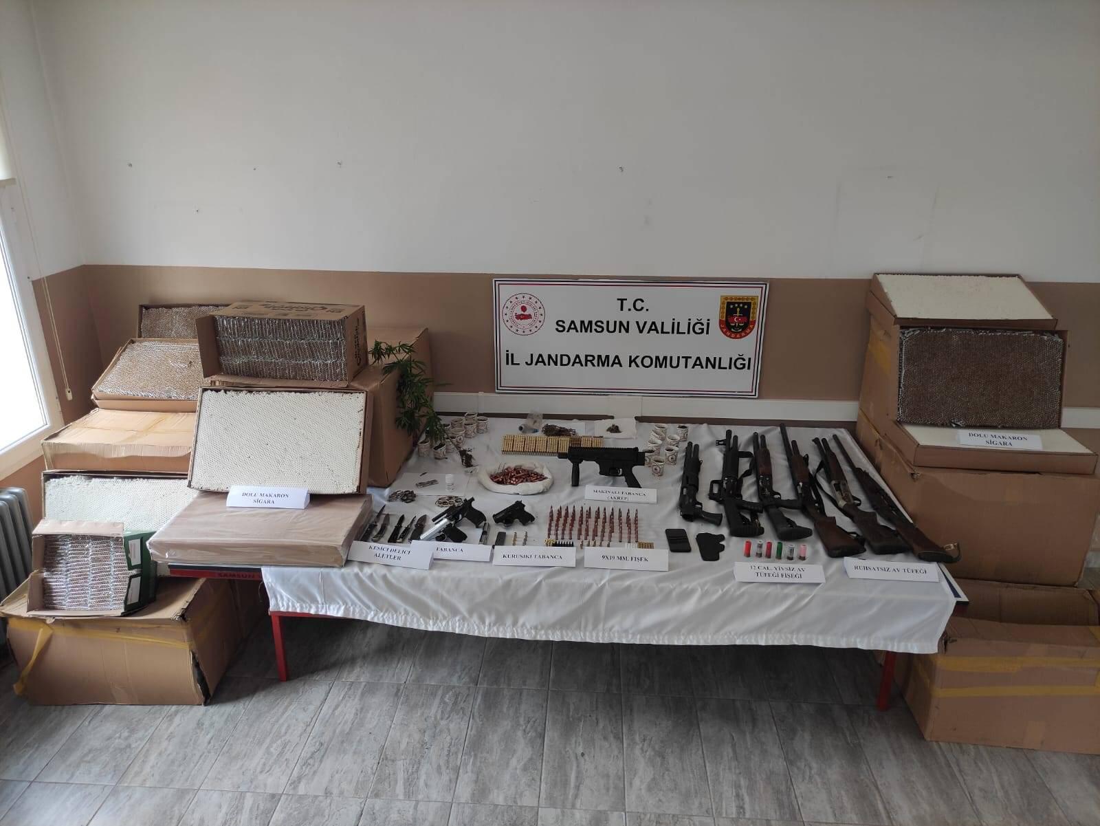 SAMSUN’un Ayvacık ve Çarşamba ilçesinde ‘tehdit, darp ve kişiyi hürriyetinden yoksun kılma’ gibi suçları işleyenlere yönelik düzenlenen operasyonda 10 şüpheli gözaltına alındı. Şüphelilerin evlerinde yapılan aramalarda, tavan arasına gizlenmiş silah, mermi ve uyuşturucu ele geçirildi. İl Jandarma Komutanlığı İstihbarat Şube Müdürlüğü, Kaçakçılık ve Organize Suçlarla Mücadele Şube Müdürlüğü, Jandarma Suç Araştırma Timi ve Ayvacık İlçe Jandarma Komutanlığı ekipleri, ‘tehdit’ , ‘darp’ , ‘cebir kullanmak’ , ‘kişiyi hürriyetinden yoksun kılma’ ve ‘kişiyi suç üstlenmeye zorlama’ suçlarını işlediği tespit edilen şüphelilerin yakalanmasına yönelik çalışma başlattı. Ayvacık ve Çarşamba ilçelerindeki ikamet, iş yeri ve araçlarda yapılan aramalarda, bir kısmı evin tavan arasına gizlenmiş 1 makineli tabanca, 1 tabanca, 2 kurusıkı tabanca, 6 av tüfeği, 245 piyade tüfeği fişeği, 18 adet 7,65 milimetre çapında fişek, 917 adet 9 milimetre çapında fişek, 6 av tüfeği fişeği, 11 bıçak ve muşta, piyasa değeri yaklaşık 525 bin lira olan 291 bin 940 dal tütün dolu makaron, 10 gram esrar ve 38 sentetik hap ele geçirildi. Olayla ilgili 10 şüpheli, gözaltına alındı. Jandarmadaki sorguları tamamlanan 8 şüpheli, serbest bırakıldı. Adliyeye sevk edilen İ.Ç. ve M.K. ise çıkarıldığı hakimlik tarafından tutuklanıp, cezaevine gönderildi.