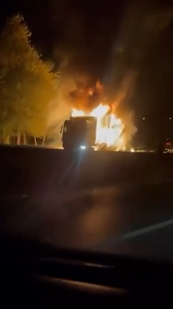 • Kocaeli’den aldığı kimyasal madde ve boyaları Azerbaycan’a götürmek üzere yola çıkan TIR, Samsun’da seyir halindeyken alev aldı. Yaklaşık 8 kilometre boyunca yanan araç, bariyerlere çarparak durabildi. Fotoğraf: Samsun, (DHA)