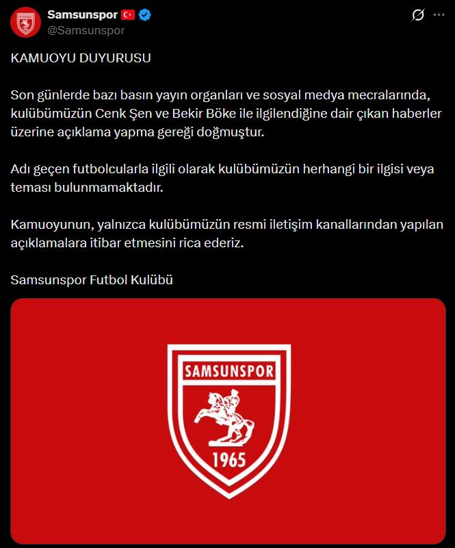 Kırmızı-beyazlı kulüp, Bodrumspor forması giyen Cenk Şen ile Sivasspor’da oynayan Bekir Böke ile ilgilenildiğine yönelik haberlerin gerçeği yansıtmadığını duyurdu. Kulüpten yapılan açıklamada, “Son günlerde bazı basın yayın organları ve sanal medya mecralarında, kulübümüzün Cenk Şen ve Bekir Böke ile ilgilendiğine dair çıkan haberler üzerine açıklama yapma gereği doğmuştur. Adı geçen futbolcularla ilgili olarak kulübümüzün herhangi bir ilgisi veya teması bulunmamaktadır. Kamuoyunun, yalnızca kulübümüzün resmi iletişim kanallarından yapılan açıklamalara itibar etmesini rica ederiz” ifadelerine yer verildi.