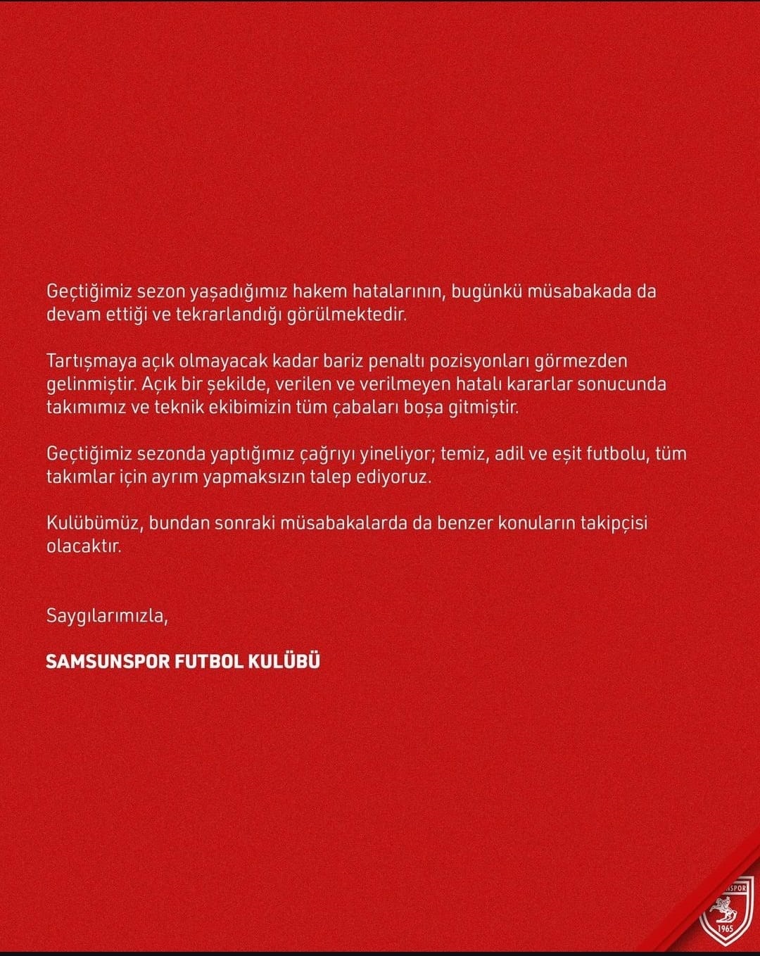 Geçtiğimiz sezon yaşadığımız hakem hatalarının, bugünkü müsabakada da devam ettiği ve tekrarlandığı görülmektedir. Tartışmaya açık olmayacak kadar bariz penaltı pozisyonları görmezden gelinmiştir. Açık bir şekilde, verilen ve verilmeyen hatalı kararlar sonucunda takımımız ve teknik ekibimizin tüm çabaları boşa gitmiştir. Geçtiğimiz sezonda yaptığımız çağrıyı yineliyor; temiz, adil ve eşit futbolu, tüm takımlar için ayrım yapmaksızın talep ediyoruz. Kulübümüz, bundan sonraki müsabakalarda da benzer konuların takipçisi olacaktır.”