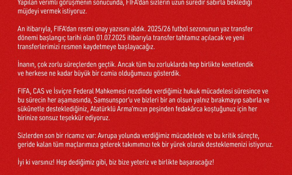 Samsunspor Futbol Kulübü, FIFA yetkilileriyle yapılan görüşmeler sonucunda 1 Temmuz 2025 itibarıyla transfer tahtasının açılması için resmi onay yazısını aldığını açıkladı. Kulübün sosyal medya hesaplarından yapılan açıklamada ise, “10 Mart Pazartesi günü Kulüp Başkanımız Sayın Yüksel Yıldırım ile Kulüp Avukatımız Sayın Anıl Dinçer’in FIFA’ya gerçekleştirdiği ziyarette, FIFA yetkililerine uluslararası vizyonumuzu açıklayıp Avrupa hedeflerimizi anlattık. Yapılan verimli görüşmenin sonucunda, FIFA’dan sizlerin uzun süredir sabırla beklediği müjdeyi vermek istiyoruz. An itibarıyla, FIFA’dan resmi onay yazısını aldık. 2025/26 futbol sezonunun yaz transfer dönemi başlangıç tarihi olan 1 Temmuz 2025 itibarıyla transfer tahtamız açılacak ve yeni transferlerimizi resmen kaydetmeye başlayacağız. İnanın, çok zorlu süreçlerden geçtik. Ancak tüm bu zorluklarda hep birlikte kenetlendik ve herkese ne kadar büyük bir camia olduğumuzu gösterdik. FIFA, CAS ve İsviçre Federal Mahkemesi nezdinde verdiğimiz hukuk mücadelesi süresince ve bu sürecin her aşamasında, Samsunspor’u ve bizleri bir an olsun yalnız bırakmayıp sabırla ve sükûnetle desteklediğiniz, Atatürklü Arma’mızın peşinden fedakârca koştuğunuz için her birinize sonsuz teşekkür ediyoruz. Sizlerden son bir ricamız var: Avrupa yolunda verdiğimiz mücadelede ve bu kritik süreçte, geride kalan tüm maçlarımıza gelerek takımımızı tek bir yürek olarak desteklemenizi istiyoruz” ifadelerine yer verildi.