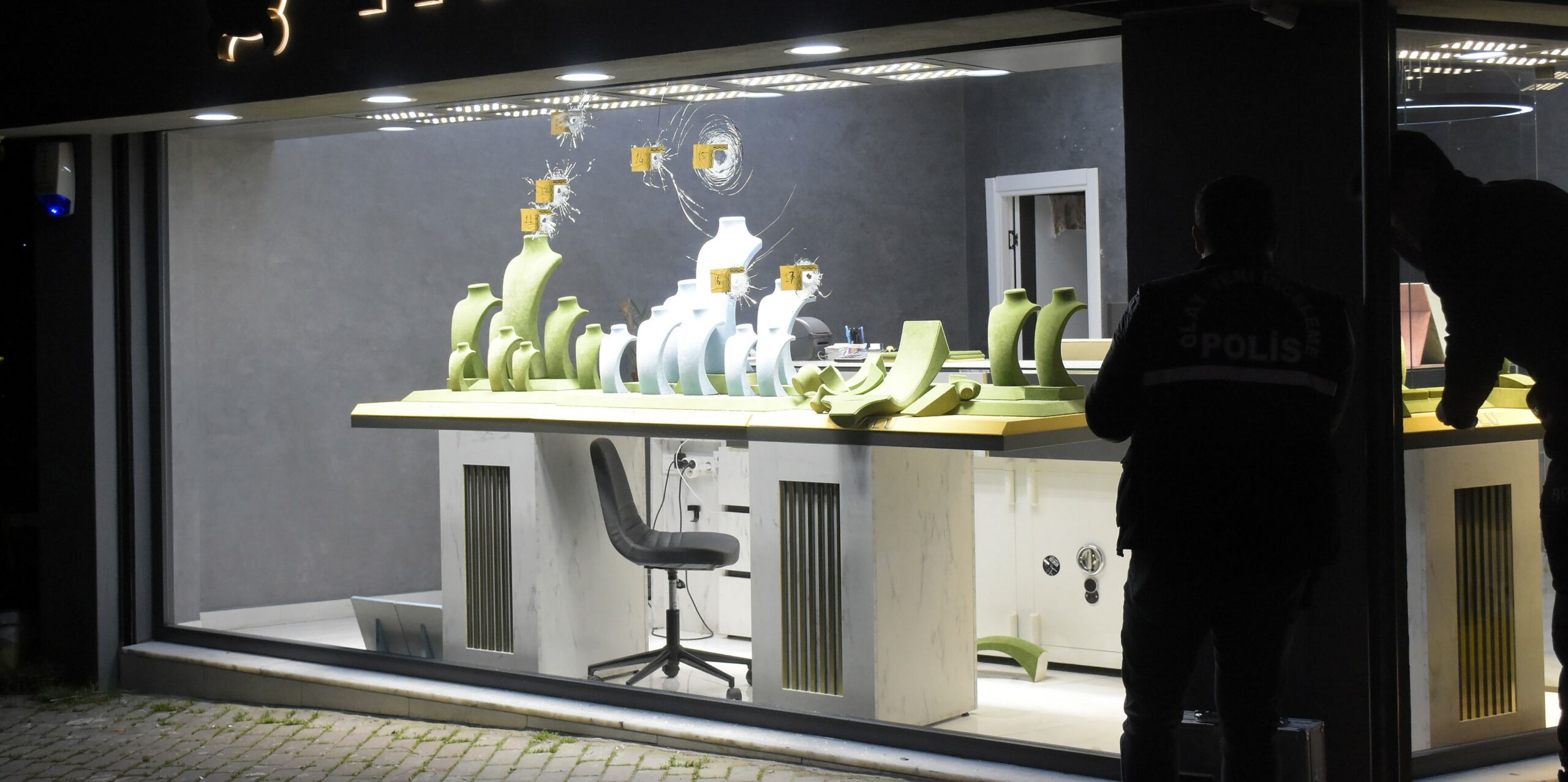SARIYER’de, kuyumcu dükkanına yüzü maskeli bir kişi tarafından silahlı saldırı düzenlendi. İş yerinin kapalı olduğu saatlerde gerçekleşen saldırıda yaralanan olmazken, cam ve tabelaya 10 kurşun isabet etti.