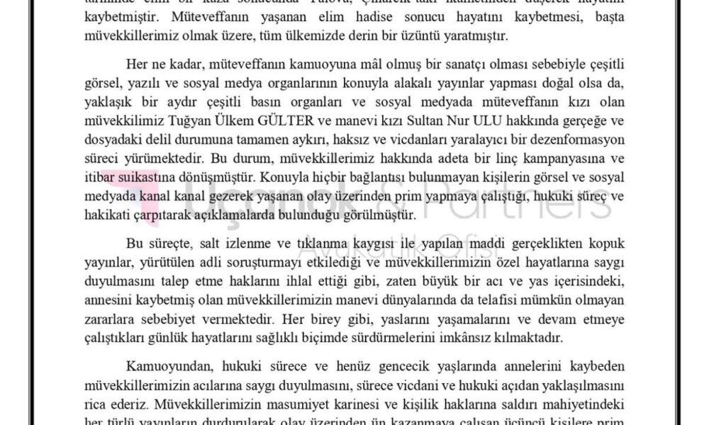 “Kamuoyunun malumu olduğu üzere, ünlü ses sanatçısı Güllü (Gül Tut) 26.09.2025 tarihinde elim bir kaza sonucunda Yalova, Çınarcıktaki ikametinden düşerek hayatını kaybetmiştir. Müteveffanın yaşanan elim hadise sonucu hayatını kaybetmesi, başta müvekkillerimiz olmak üzere, tüm ülkemizde derin bir üzüntü yaratmıştır. Her ne kadar, müteveffanın kamuoyuna mâl olmuş bir sanatçı olması sebebiyle çeşitli görsel, yazılı ve sosyal medya organlarının konuyla alakalı yayınlar yapması doğal olsa da yaklaşık bir aydır çeşitli basın organları ve sosyal medyada müteveffanın kızı olan müvekkilimiz Tuğyan Ülkem Gülter ve manevi kızı Sultan Nur Ulu hakkında gerçeğe ve dosyadaki delil durumuna tamamen aykırı, haksız ve vicdanları yaralayıcı bir dezenformasyon süreci yürümektedir. Bu durum, müvekkillerimiz hakkında adeta bir linç kampanyasına ve itibar suikastına dönüşmüştür. Konuyla hiçbir bağlantısı bulunmayan kişilerin görsel ve sosyal medyada kanal kanal gezerek yaşanan olay üzerinden prim yapmaya çalıştığı, hukuki süreç ve hakikati çarpıtarak açıklamalarda bulunduğu görülmüştür. Bu süreçte, salt izlenme ve tıklanma kaygısı ile yapılan maddi gerçeklikten kopuk yayınlar, yürütülen adli soruşturmayı etkilediği ve müvekkillerimizin özel hayatlarına saygı duyulmasını talep etme haklarını ihlal ettiği gibi, zaten büyük bir acı ve yas içerisindeki, annesini kaybetmiş olan müvekkillerimizin manevi dünyalarında da telafisi mümkün olmayan zararlara sebebiyet vermektedir. Her birey gibi, yaslarını yaşamalarını ve devam etmeye çalıştıkları günlük hayatlarını sağlıklı biçimde sürdürmelerini imkansız kılmaktadır.”