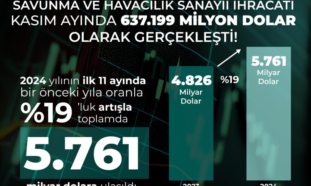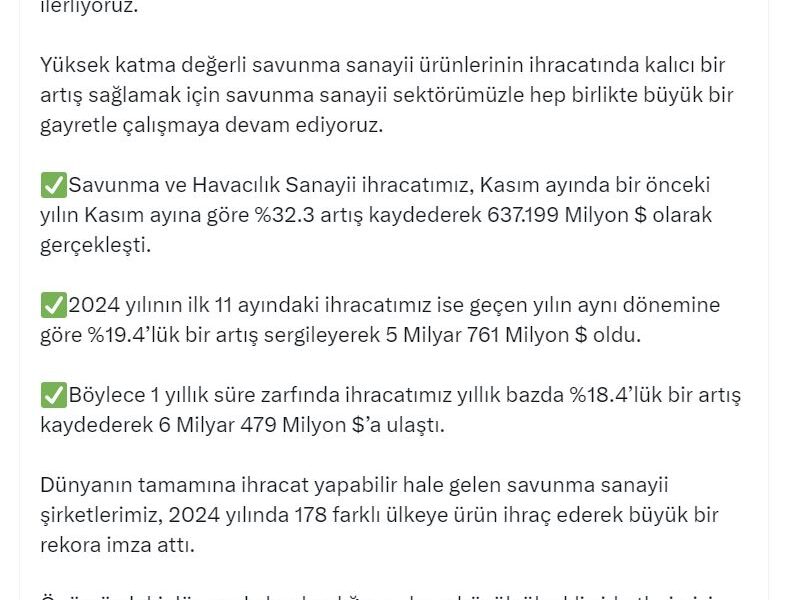 Savunma Sanayii Başkanı Haluk Görgün, sosyal medya hesabından yaptığı açıklamada, sürdürülebilir ihracat hedeflerine güçlü ve emin adımlarla ilerlediklerini belirterek, “Yüksek katma değerli savunma sanayi ürünlerinin ihracatında kalıcı bir artış sağlamak için savunma sanayii sektörümüzle hep birlikte büyük bir gayretle çalışmaya devam ediyoruz. Savunma ve havacılık sanayi ihracatımız, kasım ayında bir önceki yılın kasım ayına göre yüzde 32.3 artış kaydederek 637.199 milyon dolar olarak gerçekleşti. 2024 yılının ilk 11 ayındaki ihracatımız ise geçen yılın aynı dönemine göre yüzde 19.4lük bir artış sergileyerek 5 milyar 761 milyon dolar oldu. Böylece 1 yıllık süre zarfında ihracatımız yıllık bazda yüzde 18.4lük bir artış kaydederek 6 milyar 479 milyon dolara ulaştı” dedi.