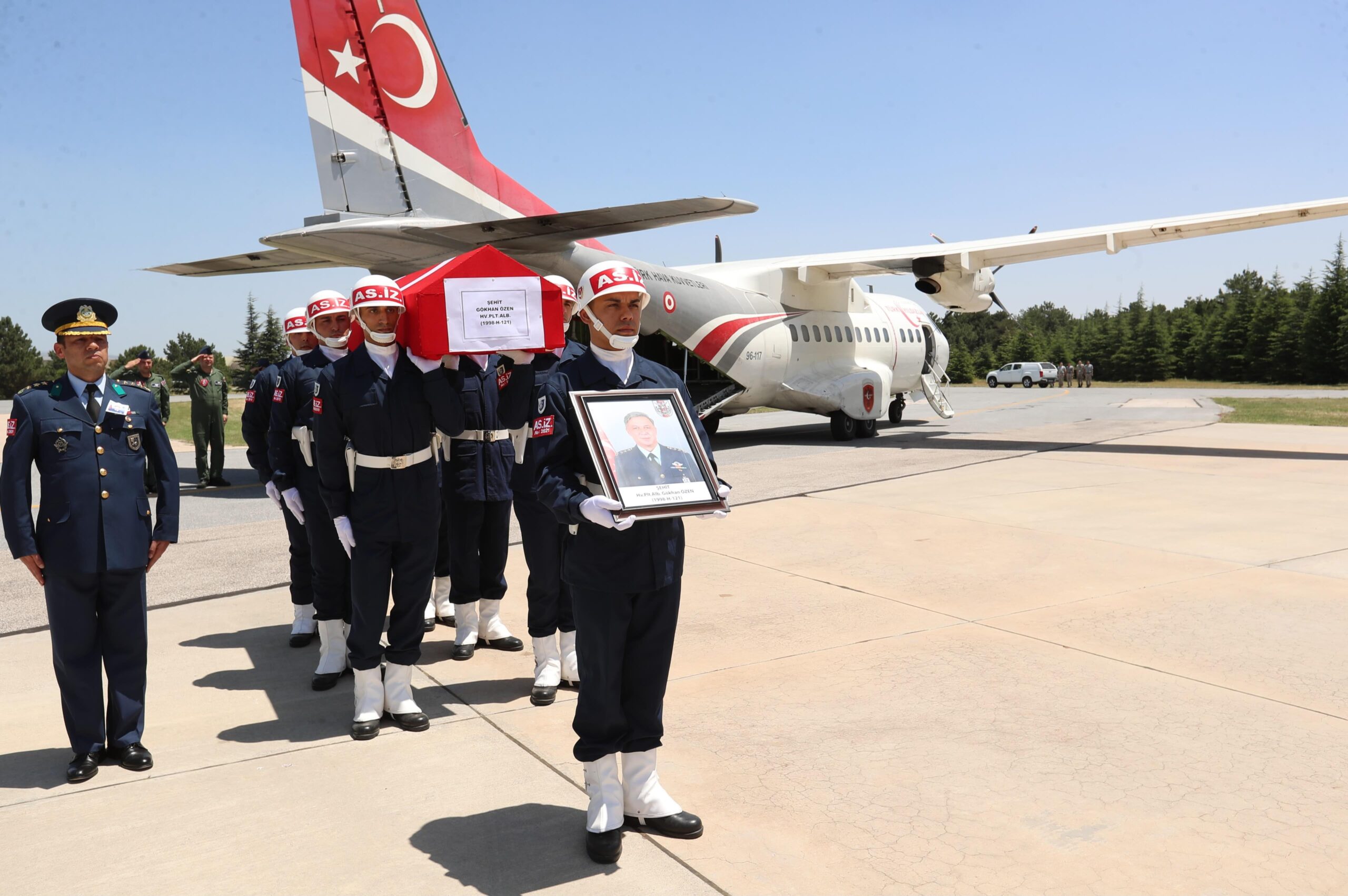 • Kayseri’de kırıma uğrayıp düşen eğitim uçağında şehit olan iki pilottan evli ve 9 yaşında kız babası olan Hava Pilot Albay Gökhan Özen’in (48) cenazesi askeri uçakla memleketi Eskişehir’e getirildi. Fotoğraf: Eskişehir,(DHA)