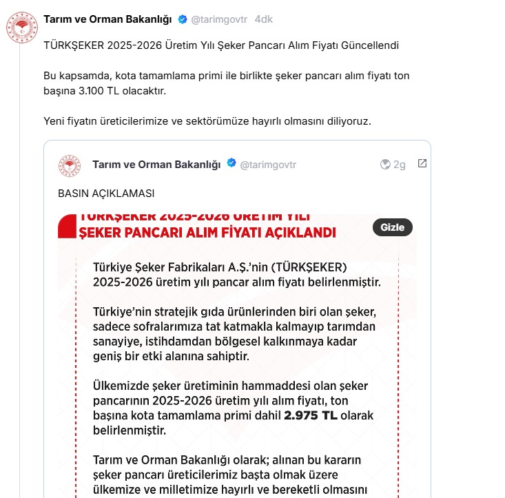Bakanlığın sosyal medya hesabından yapılan açıklamada, “TÜRKŞEKER 2025-2026 üretim yılı şeker pancarı alım fiyatı güncellendi. Bu kapsamda, kota tamamlama primi ile birlikte şeker pancarı alım fiyatı ton başına 3 bin 100 TL olacaktır. Yeni fiyatın üreticilerimize ve sektörümüze hayırlı olmasını diliyoruz” denildi.