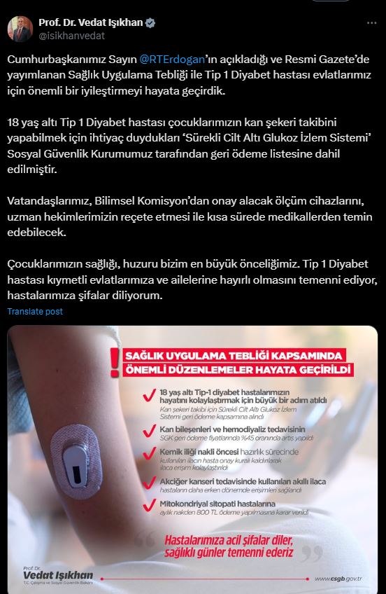 SGKnın Sağlık Uygulama Tebliğine yönelik değişikliği, Resmi Gazetenin bugünkü sayısında yayımlandı. Çalışma ve Sosyal Güvenlik Bakanı Vedat Işıkhan, tebliğ değişikliğinin getirdiği yenilikleri sosyal medya hesabından açıkladı. Bakan Işıkhan, “Cumhurbaşkanımız Sayın Recep Tayyip Erdoğanın açıkladığı ve Resmi Gazetede yayımlanan Sağlık Uygulama Tebliği ile Tip 1 Diyabet hastası evlatlarımız için önemli bir iyileştirmeyi hayata geçirdik. 18 yaş altı Tip 1 Diyabet hastası çocuklarımızın kan şekeri takibini yapabilmek için ihtiyaç duydukları Sürekli Cilt Altı Glukoz İzlem Sistemi Sosyal Güvenlik Kurumumuz tarafından geri ödeme listesine dahil edilmiştir. Vatandaşlarımız, Bilimsel Komisyondan onay alacak ölçüm cihazlarını, uzman hekimlerimizin reçete etmesi ile kısa sürede medikallerden temin edebilecek. Çocuklarımızın sağlığı, huzuru bizim en büyük önceliğimiz. Tip 1 Diyabet hastası kıymetli evlatlarımıza ve ailelerine hayırlı olmasını temenni ediyor, hastalarımıza şifalar diliyorum” ifadelerini kullandı.