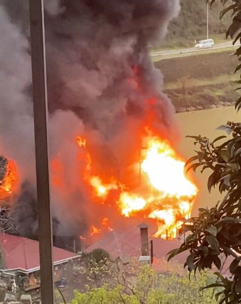 Trabzon'un Akçaabat ilçesinde doğal güzelliği ile dikkat çeken Sera Gölü kıyısındaki turistik tesis, çıkan yangında kullanılamaz hale geldi. Fotoğraf: Trabzon,(DHA)