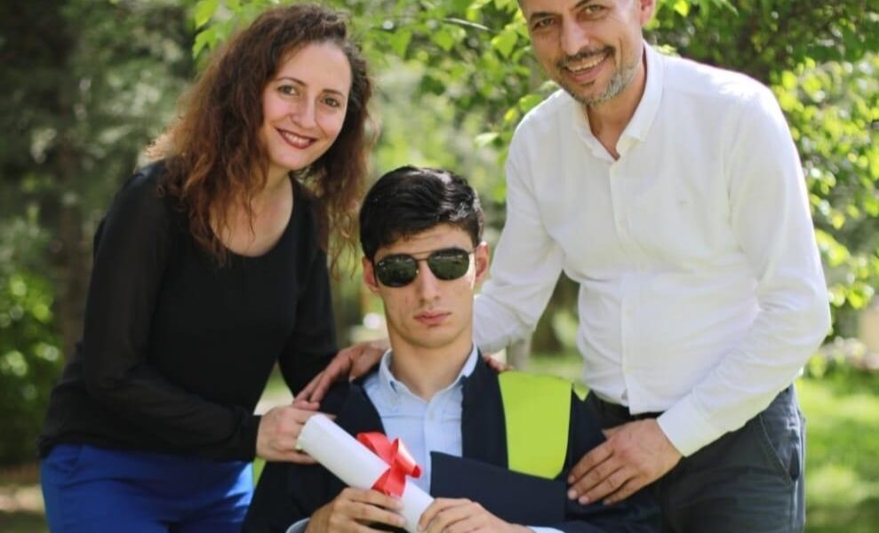 • Ankara'da doğuştan serebral palsi (SP) hastası Umut Akça (20) annesi Fatmagül, babası Ersoy Akça'nın desteği ile üniversitede okuduğu bölümü 1'inci olarak bitirdi. Fotoğraf: Ankara, (DHA)