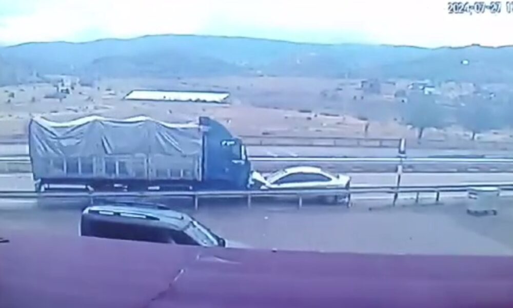 Kamyon ile otomobilin karıştığı kaza anı bölgede bulunan güvenlik kameralarına yansıdı. Görüntülerde, aynı yöne giden otomobilin sürücüsünün direksiyon hakimiyetini kaybetmesiyle karayolunda ters istikamette döndüğü ve bu sırada arkasından gelen kamyonun çarptığı görüldü.