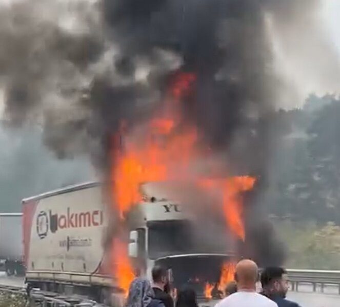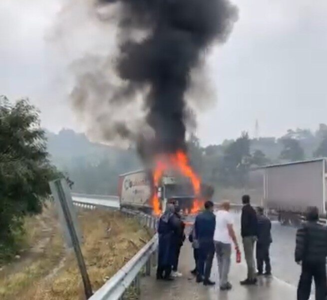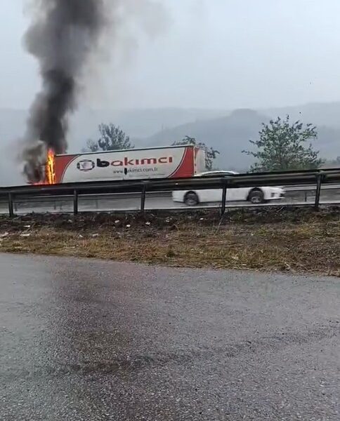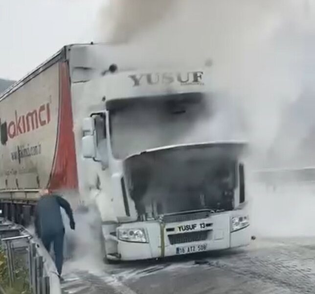 Bursa’dan Gemlik yönüne seyir halinde olan 16 ATZ 509 plakalı TIR, saat 13.30 sıralarında Dürdane rampasındayken, motor kısmında alevler yükseldi. TIR’ı yol kenarına çekip, araçtan inen şoför, yangın söndürme tüpüyle alevlere müdahale etmek istedi. Ancak yapamadı. Alevler TIR’ın ön kısmını sararken, o anlar yoldan geçen diğer sürücüler tarafından cep telefonu kamerasıyla görüntülendi.