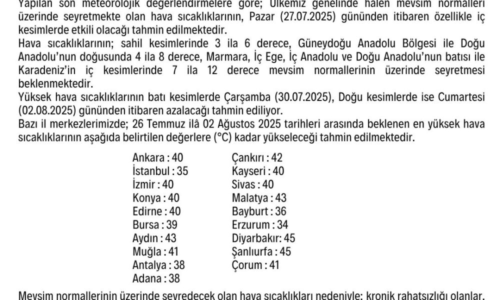 Meteoroloji Genel Müdürlüğü tarafından yapılan son meteorolojik değerlendirmelere göre; ülke genelinde mevsim normalleri üzerinde seyreden hava sıcaklıkları, pazar gününden itibaren özellikle iç kesimlerde etkili olacak. Hava sıcaklıklarının sahil kesimlerinde 3 ila 6 derece, Güneydoğu Anadolu Bölgesi ile Doğu Anadolunun doğusunda 4 ila 8 derece, Marmara, İç Ege, İç Anadolu ve Doğu Anadolunun batısı ile Karadenizin iç kesimlerinde 7 ila 12 derece mevsim normallerinin üzerinde seyretmesi bekleniyor. Yüksek hava sıcaklıklarının batı kesimlerde 30 Temmuz Çarşamba, doğu kesimlerde ise 2 Ağustos Cumartesi gününden itibaren azalması bekleniyor. 27 Temmuz ile 02 Ağustos arasında hava sıcaklıklarının Ankarada 40, İstanbulda 35, Çankırıda 42, İzmir, Konya, Sivas, Edirnede 40, Bursada 39, Aydın, Malatyada 43, Muğlada 41, Antalya, Adanada 38, Diyarbakır ve Şanlıurfada 45 derece olması bekleniyor. Açıklamada, mevsim normallerinin üzerinde seyredecek hava sıcaklıkları nedeniyle; kronik rahatsızlığı olanlar, yaşlılar ve çocuklar başta olmak üzere vatandaşların günün en sıcak saatleri 11.00 ile 16.00 arasında açık alanda bulunmamaları konusunda dikkatli ve tedbirli olmaları istendi.