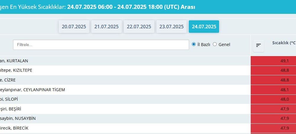 Öte yandan Meteoroloji Genel Müdürlüğü verilerine göre dün 06.00 ile 18.00 saatleri arasında Siirtin Kurtalan ilçesi, 49,1 derece ile Türkiyenin en sıcak yeri oldu. Kurtalanı, Mardin’in Kızıltepe ilçesi 48,8 ve Şırnak’ın Cizre ilçesi 48,8 ile takip etti.