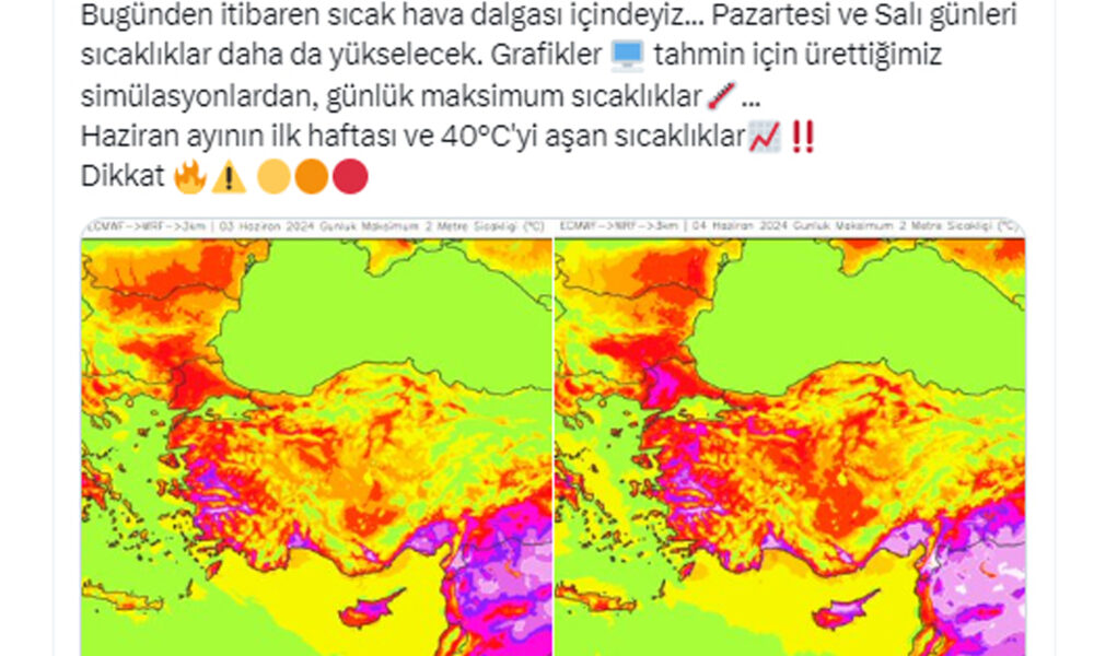 “Bugünden itibaren sıcak hava dalgası içindeyiz. Pazartesi ve salı günleri sıcaklıklar daha da yükselecek. Grafikler tahmin için ürettiğimiz simülasyonlardan, günlük maksimum sıcaklıklar. Haziran ayının ilk haftası ve 40 dereceyi aşan sıcaklıklar. Sıcak günler bitti, çok daha sıcak günler kapıda. Kıpkırmızı gezegen.”