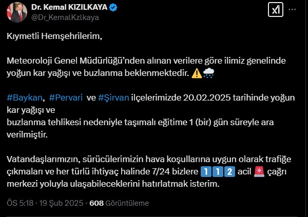 Vali Kemal Kızılkaya, sosyal medya hesabından yaptığı paylaşımda, kentte beklenen yoğun kar yağışı ve buzlanma nedeniyle Baykan, Pervari ve Şirvan ilçelerinde taşımalı eğitime 1 gün ara verildiğini duyurdu. Kızılkaya, paylaşımında, “Meteoroloji Genel Müdürlüğü’nden alınan verilere göre ilimiz genelinde yoğun kar yağışı ve buzlanma beklenmektedir. Baykan, Pervari ve Şirvan ilçelerimizde 20 Şubat 2025 tarihinde yoğun kar yağışı ve buzlanma tehlikesi nedeniyle taşımalı eğitime 1 gün süreyle ara verilmiştir. Vatandaşlarımızın, sürücülerimizin hava koşullarına uygun olarak trafiğe çıkmaları ve her türlü ihtiyaç halinde 7/24 bizlere 112 Acil Çağrı Merkezi yoluyla ulaşabileceklerini hatırlatmak isterim” ifadelerine yer verdi.