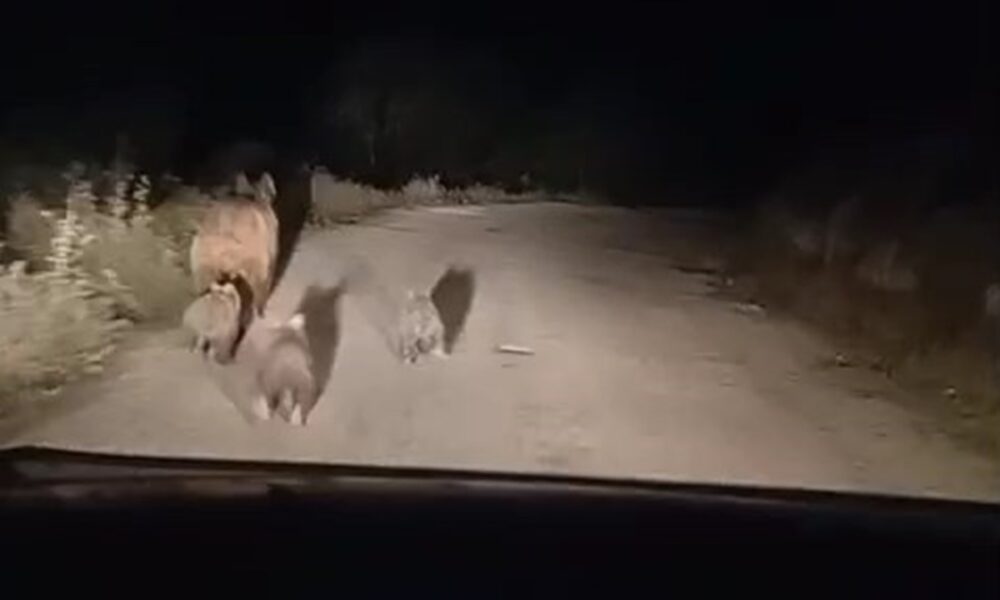 Siirt’te köy yoluna inen ayı ve yavruları kamerada