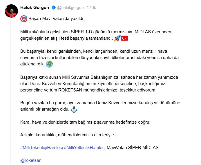 Savunma Sanayii Başkanlığı tarafından başlatılan SİPER Projesi kapsamında milli imkanlarla geliştirilen SİPER 1-D güdümlü mermisinin test faaliyetleri devam ediyor. Bu kapsamda MİDLAS üzerinden gerçekleştirilen atışlı test faaliyeti tamamlandı. Savunma Sanayii Başkanı Haluk Görgün, test faaliyetine ilişkin görüntüleri Başarı Mavi Vatanda yazıldı notu ile sosyal medya hesabından paylaştı. Görgün, “Bu başarıyla, kendi gemisinden, kendi lançerinden, kendi uzun menzilli hava savunma füzesini kullanabilen dünyadaki sayılı ülkeler arasındaki yerimizi daha da güçlendirdik. Başarıya katkı sunan Milli Savunma Bakanlığımıza, sahada her zaman yanımızda olan Deniz Kuvvetleri Komutanlığımızın kıymetli personeline, başkanlığımız personeline ve tüm ROKETSAN mühendislerimize, teşekkür ediyorum. Bugün yazılan bu gurur, aynı zamanda Deniz Kuvvetlerimizin kuruluş yıl dönümüne anlamlı bir armağan oldu. Kara, hava ve denizlerde tam bağımsız savunma hedefimize doğru azimle, kararlılıkla, mühendislerimizin alın teriyle” ifadelerine yer verildi.