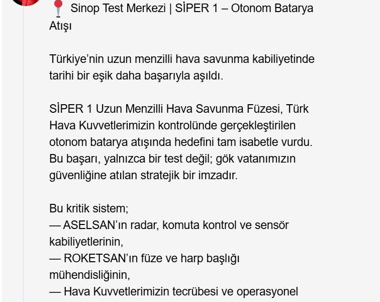 ASELSAN ve ROKETSANın ortaklığında hayata geçirilen SİPER 1 uzun menzilli hava savunma füzesi, Sinop Test Merkezinde gerçekleştirilen otonom batarya atışında hedefini tam isabetle vurdu. Savunma Sanayii Başkanı Haluk Görgün, NSosyal hesabından test atışına ilişkin görüntüleri paylaşarak, “Türkiyenin uzun menzilli hava savunma kabiliyetinde tarihi bir eşik daha başarıyla aşıldı. SİPER 1 uzun menzilli hava savunma füzesi, Türk Hava Kuvvetlerimizin kontrolünde gerçekleştirilen otonom batarya atışında hedefini tam isabetle vurdu. Bu başarı, yalnızca bir test değil; gök vatanımızın güvenliğine atılan stratejik bir imzadır. Bu kritik sistem; ASELSANın radar, komuta kontrol ve sensör kabiliyetlerinin, ROKETSANın füze ve harp başlığı mühendisliğinin, Hava Kuvvetlerimizin tecrübesi ve operasyonel birikiminin mükemmel bir uyumla birleştiği yerli ve milli bir güç çarpanıdır. Bugün elde edilen sonuç, Türkiyenin hava savunmasında kendi gök kalkanını inşa etme iradesinin ve mühendislik kudretinin en somut göstergelerinden biridir. SİPER, yalnızca bir savunma sisteminin adı değil; milletimizin ufkunu, iradesini ve bağımsızlığını koruyan çelikten bir sözdür. Bu başarı için; ASELSANa, ROKETSANa, Türk Hava Kuvvetlerimizin kahraman personeline ve tüm mühendislerimize, teknisyenlerimize gönülden teşekkür ediyorum. Gök vatan emin ellerdedir. Daha ileri, daha güçlü, daha yüksek hedeflere doğru” ifadelerini kullandı.