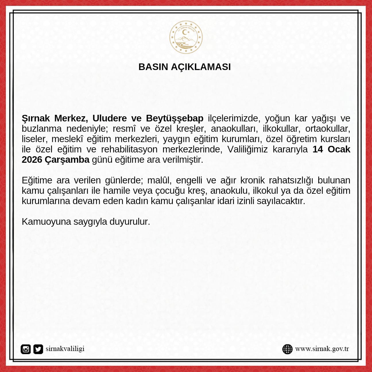 Şırnak Valiliği’nden yapılan açıklamada, yoğun kar yağışı ve buzlanma nedeniyle kent merkezi ile Uludere ve Beytüşşebap ilçelerinde 14 Ocak Çarşamba günü eğitime ara verildiği belirtildi. Açıklamada, “Şırnak merkez, Uludere ve Beytüşşebap ilçelerimizde, yoğun kar yağışı ve buzlanma nedeniyle; resmi ve özel kreşler, anaokulları, ilkokullar, ortaokullar, liseler, mesleki eğitim merkezleri, yaygın eğitim kurumları, özel öğretim kursları ile özel eğitim ve rehabilitasyon merkezlerinde, Valiliğimiz kararıyla 14 Ocak 2026 Çarşamba günü eğitime ara verilmiştir. Eğitime ara verilen günlerde; malul, engelli ve ağır kronik rahatsızlığı bulunan kamu çalışanları ile hamile veya çocuğu kreş, anaokulu, ilkokul ya da özel eğitim kurumlarına devam eden kadın kamu çalışanları idari izinli sayılacaktır” denildi.