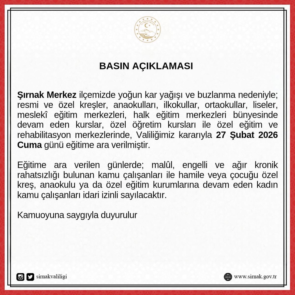 Şırnak Valiliği, kent merkezinde etkili olan kar yağışı ve buzlanma nedeniyle merkez ilçede tüm eğitim kurumlarında 27 Şubat Cuma günü eğitime ara verildiğini duyurdu. Valilik açıklamasında, “Şırnak Merkez ilçemizde yoğun kar yağışı ve buzlanma nedeniyle; resmi ve özel kreşler, anaokulları, ilkokullar, ortaokullar, liseler, meslekî eğitim merkezleri, halk eğitim merkezleri bünyesinde devam eden kurslar, özel öğretim kursları ile özel eğitim ve rehabilitasyon merkezlerinde, Valiliğimiz kararıyla 27 Şubat 2026 Cuma günü eğitime ara verilmiştir. Eğitime ara verilen günlerde; malûl, engelli ve ağır kronik rahatsızlığı bulunan kamu çalışanları ile hamile veya çocuğu özel kreş, anaokulu ya da özel eğitim kurumlarına devam eden kadın kamu çalışanları idari izinli sayılacaktır” denildi.