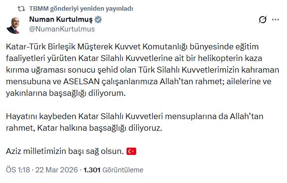 TBMM Başkanı Numan Kurtulmuş, sanal medya hesabından paylaştığı mesajda, “Katar-Türk Birleşik Müşterek Kuvvet Komutanlığı bünyesinde eğitim faaliyetleri yürüten Katar Silahlı Kuvvetlerine ait bir helikopterin kaza kırıma uğraması sonucu şehit olan Türk Silahlı Kuvvetlerimizin kahraman mensubuna ve ASELSAN çalışanlarımıza Allah’tan rahmet; ailelerine ve yakınlarına başsağlığı diliyorum. Hayatını kaybeden Katar Silahlı Kuvvetleri mensuplarına da Allah’tan rahmet, Katar halkına başsağlığı diliyoruz. Aziz milletimizin başı sağ olsun” dedi.