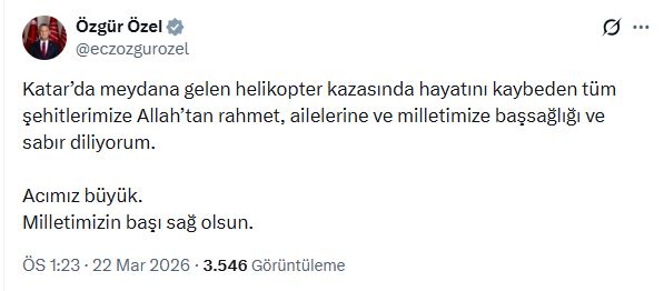 CHP Genel Başkanı Özgür Özel, Katarda şehit olan personele ilişkin sanal medya hesabından taziye dileklerini iletti. Özel, “Katar’da meydana gelen helikopter kazasında hayatını kaybeden tüm şehitlerimize Allah’tan rahmet, ailelerine ve milletimize başsağlığı ve sabır diliyorum. Acımız büyük. Milletimizin başı sağ olsun” ifadelerini kaydetti.