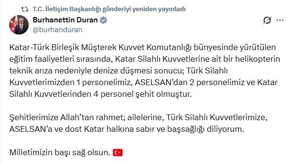 İletişim Başkanı Burhanettin Duran da sanal medya hesabından paylaştığı taziye mesajında, “Katar-Türk Birleşik Müşterek Kuvvet Komutanlığı bünyesinde yürütülen eğitim faaliyetleri sırasında, Katar Silahlı Kuvvetlerine ait bir helikopterin teknik arıza nedeniyle denize düşmesi sonucu; Türk Silahlı Kuvvetlerimizden 1 personelimiz, ASELSAN’dan 2 personelimiz ve Katar Silahlı Kuvvetlerinden 4 personel şehit olmuştur. Şehitlerimize Allah’tan rahmet; ailelerine, Türk Silahlı Kuvvetlerimize, ASELSAN’a ve dost Katar halkına sabır ve başsağlığı diliyorum. Milletimizin başı sağ olsun” ifadelerini kullandı.