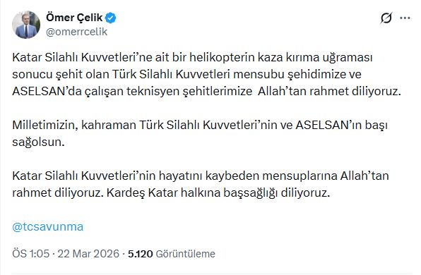 AK Parti Genel Başkan Yardımcısı ve Parti Sözcüsü Ömer Çelik, sanal medya hesabından, “Katar Silahlı Kuvvetleri’ne ait bir helikopterin kaza kırıma uğraması sonucu şehit olan Türk Silahlı Kuvvetleri mensubu şehidimize ve ASELSAN’da çalışan teknisyen şehitlerimize Allah’tan rahmet diliyoruz. Milletimizin, kahraman Türk Silahlı Kuvvetleri’nin ve ASELSAN’ın başı sağ olsun. Katar Silahlı Kuvvetleri’nin hayatını kaybeden mensuplarına Allah’tan rahmet diliyoruz. Kardeş Katar halkına başsağlığı diliyoruz” paylaşımında bulundu.