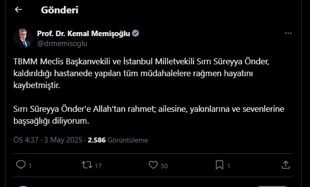 Sağlık Bakanı Kemal Memişoğlu, sosyal medya hesabından yaptığı açıklamada, “TBMM Meclis Başkan Vekili ve İstanbul Milletvekili Sırrı Süreyya Önder, kaldırıldığı hastanede yapılan tüm müdahalelere rağmen hayatını kaybetmiştir. Sırrı Süreyya Öndere Allahtan rahmet; ailesine, yakınlarına ve sevenlerine başsağlığı diliyorum” ifadelerini kullandı.
