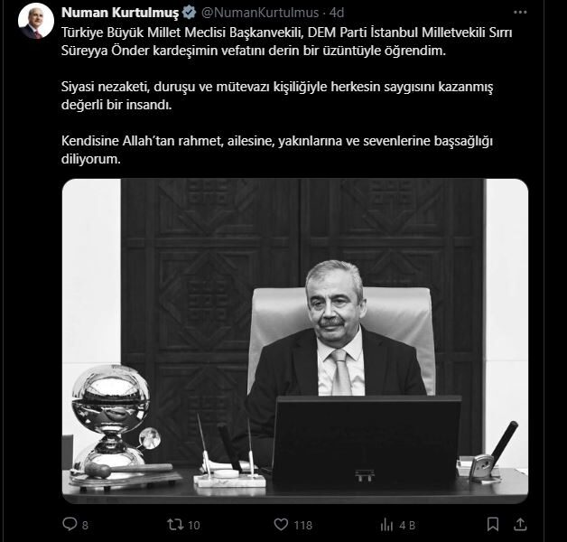 TBMM Başkanı Numan Kurtulmuş, Önderin vefatı nedeniyle sosyal medya hesabından paylaştığı mesajda, “Türkiye Büyük Millet Meclisi Başkan Vekili, DEM Parti İstanbul Milletvekili Sırrı Süreyya Önder kardeşimin vefatını, derin bir üzüntüyle öğrendim. Siyasi nezaketi, duruşu ve mütevazı kişiliğiyle herkesin saygısını kazanmış değerli bir insandı. Kendisine Allah’tan rahmet, ailesine, yakınlarına ve sevenlerine başsağlığı diliyorum” dedi.