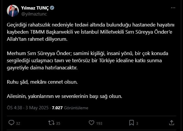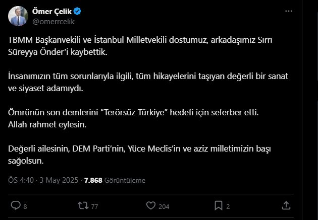 AK Parti Sözcüsü Ömer Çelik de “TBMM Başkan Vekili ve İstanbul Milletvekili dostumuz, arkadaşımız Sırrı Süreyya Önderi kaybettik. İnsanımızın tüm sorunlarıyla ilgili, tüm hikayelerini taşıyan değerli bir sanat ve siyaset adamıydı. Ömrünün son demlerini Terörsüz Türkiye hedefi için seferber etti. Allah rahmet eylesin. Değerli ailesinin, DEM Parti’nin, yüce Meclis’in ve aziz milletimizin başı sağ olsun” mesajını paylaştı.