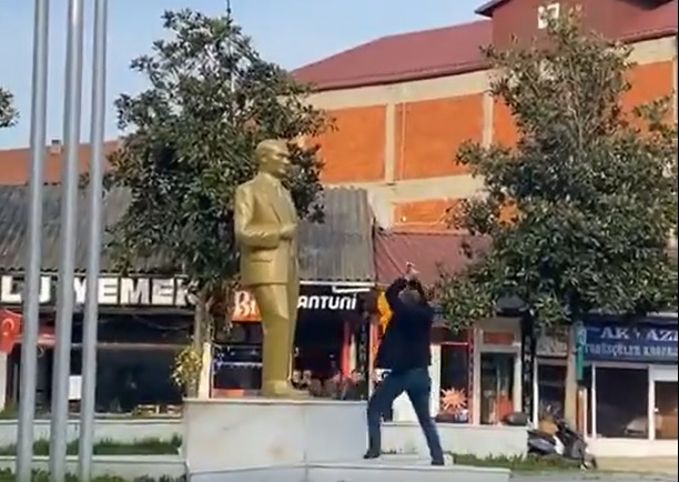 SAKARYAnın Akyazı ilçesinde şizofreni hastası bir kişi elindeki balyozla Atatürk heykeline saldırdı. Saldırı anı cep telefonu kamerasıyla görüntülenirken, şüpheli gözaltına alındı.Olay, akşam saatlerinde Akyazı ilçesine bağlı Ömercikler Mahallesinde meydana geldi. İsmi öğrenilemeyen bir kişi, elindeki balyozla Atatürk heykeline vurarak saldırdı. Çevredekilerin haber vermesi üzerine olay yerine gelen polis ekipleri tarafından şüpheli gözaltına alındı. Şüphelinin şizofreni hastası olduğu öğrenildi. Saldırı anı ise cep telefonu kamerasıyla görüntülendi.