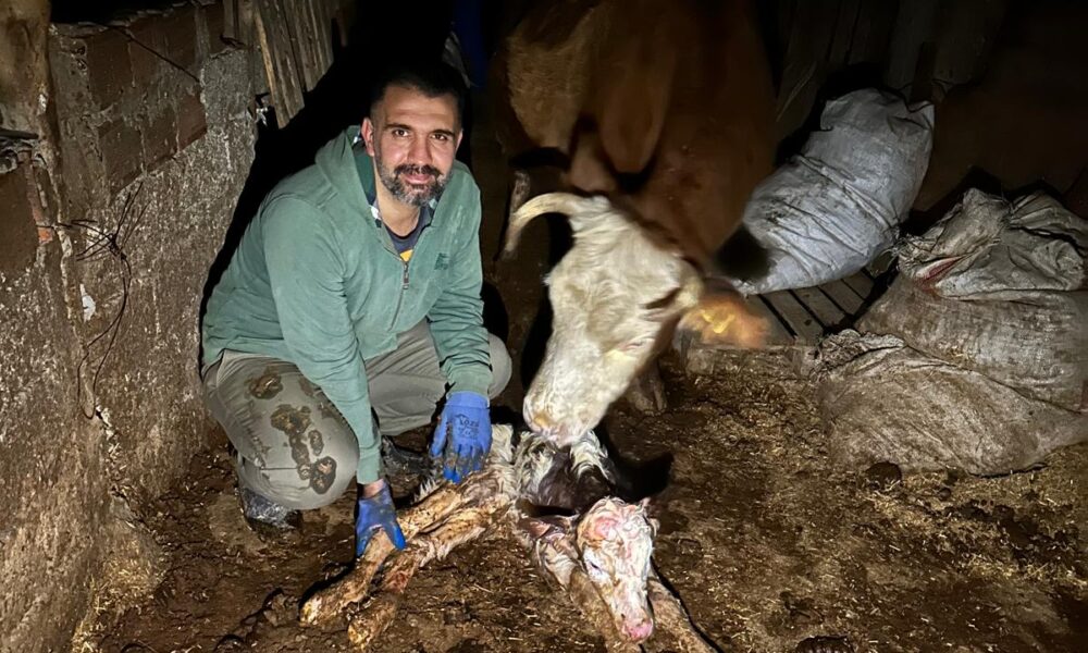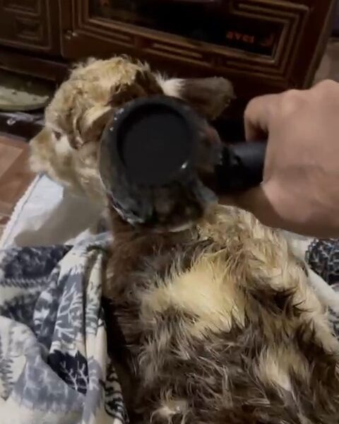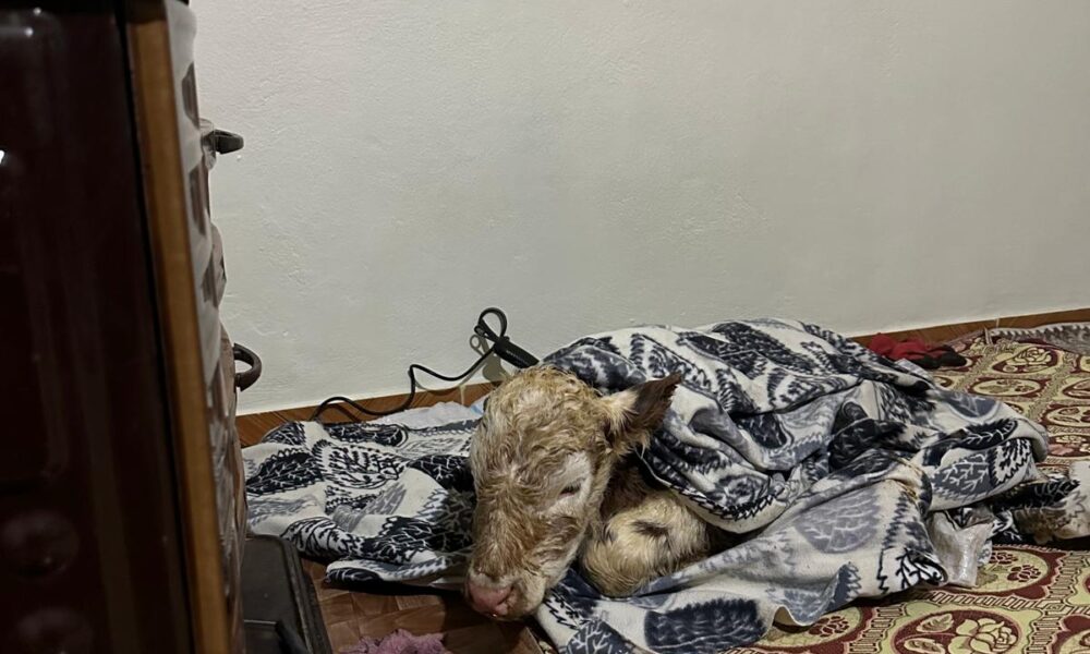 Soğuktan etkilenen buzağını evine getirip, fön makinesi ile kuruttu
