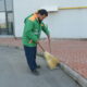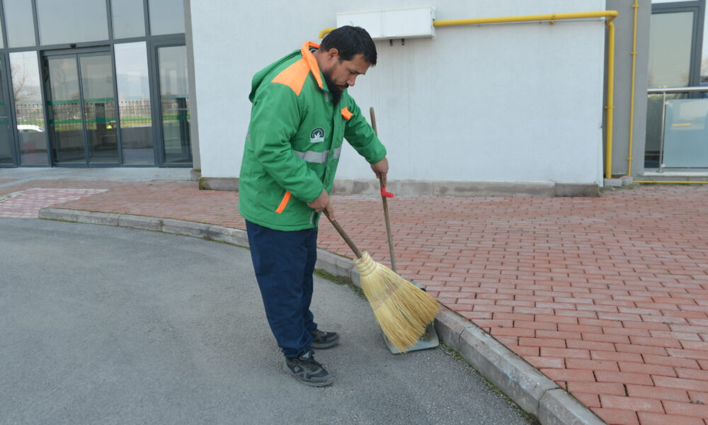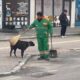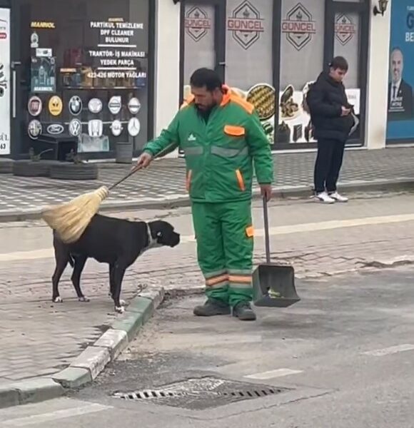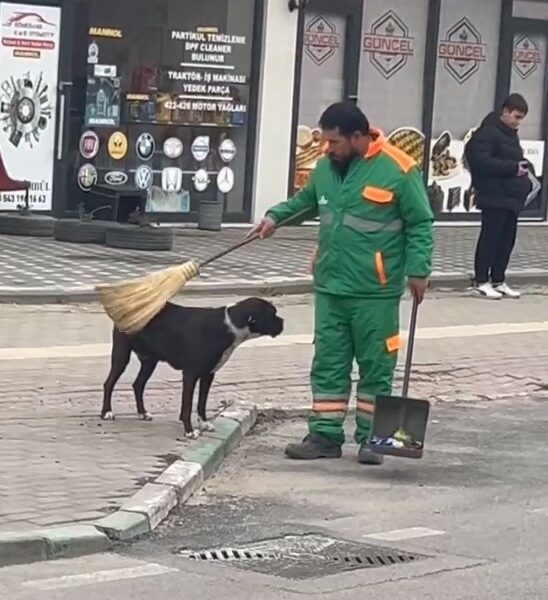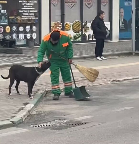 Sokak köpeğini süpürgesi ile kaşıyıp sevdi; temizlik personelinin o anları kamerada