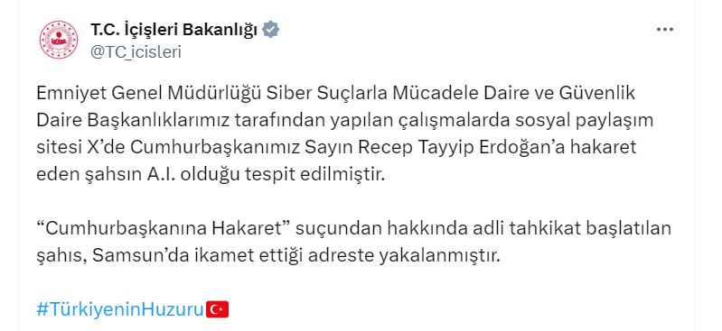 Bakanlığın sosyal medya hesabından yapılan açıklamada, “Emniyet Genel Müdürlüğü Siber Suçlarla Mücadele Daire ve Güvenlik Daire Başkanlıklarımız tarafından yapılan çalışmalarda sosyal paylaşım sitesi Xte Cumhurbaşkanımız Sayın Recep Tayyip Erdoğana hakaret eden şahsın A.İ. olduğu tespit edilmiştir. Cumhurbaşkanına hakaret suçundan hakkında adli tahkikat başlatılan şahıs, Samsunda ikamet ettiği adreste yakalanmıştır” denildi.