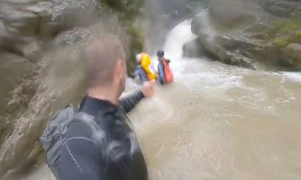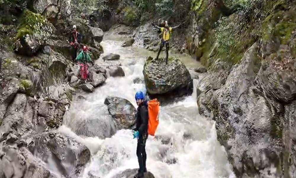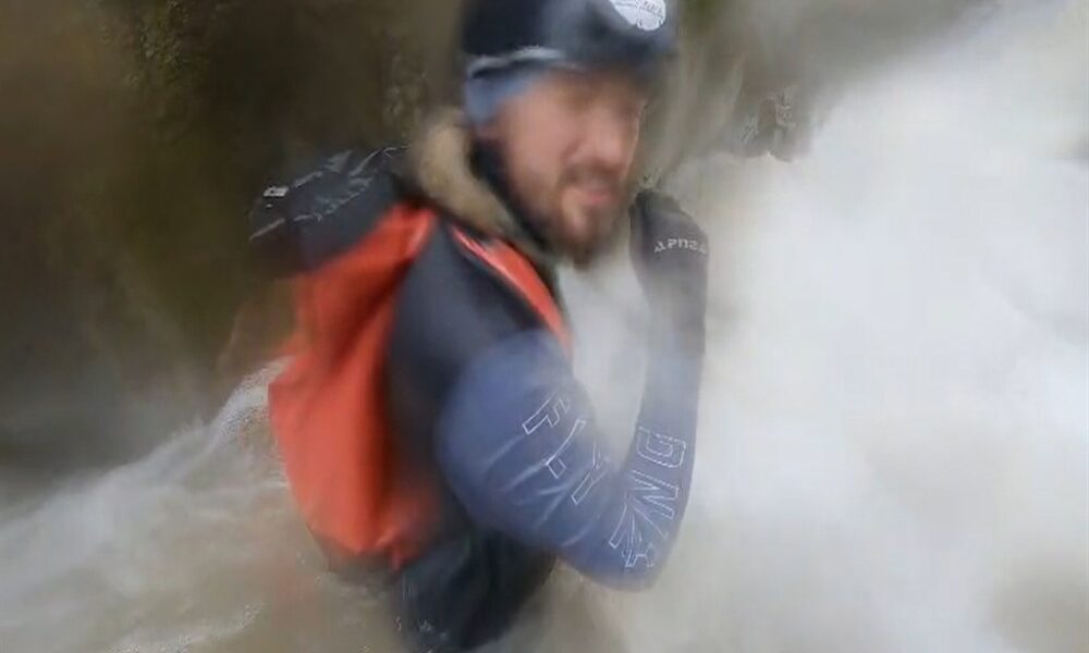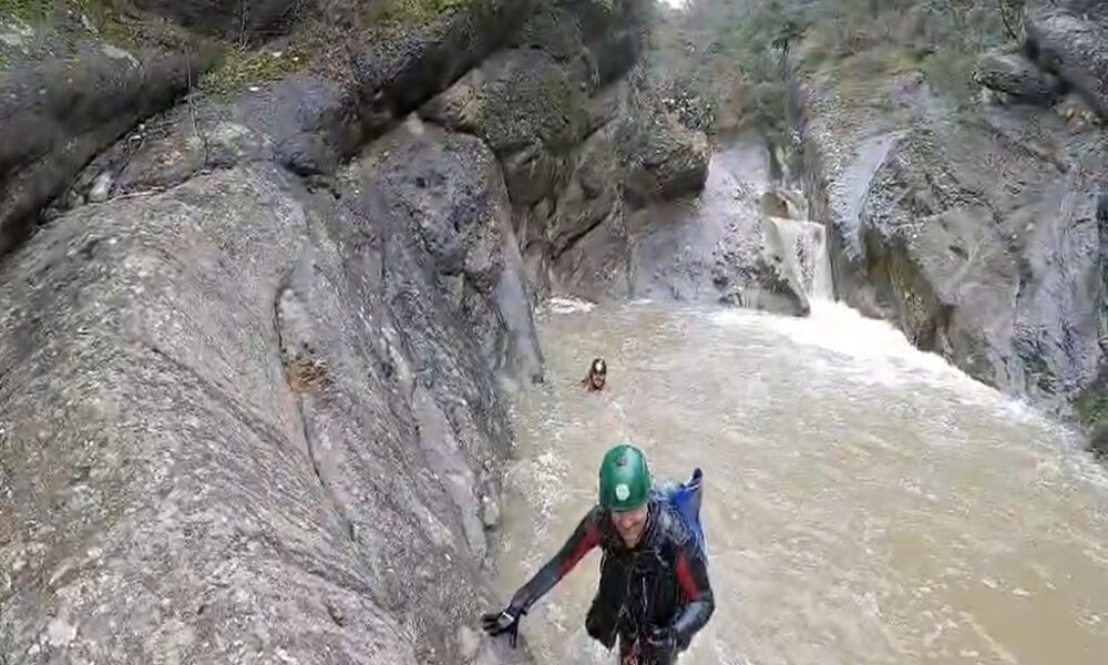 • Sölöz Kanyonu’nda su seviyesi yükselen dereden geçerken zor anlar yaşayan İbrahim Taşçı, profesyonel ekipmanlarla yola çıktıkları için endişelenmediklerini söyledi. Fotoğraf: İnegöl (Bursa), (DHA)