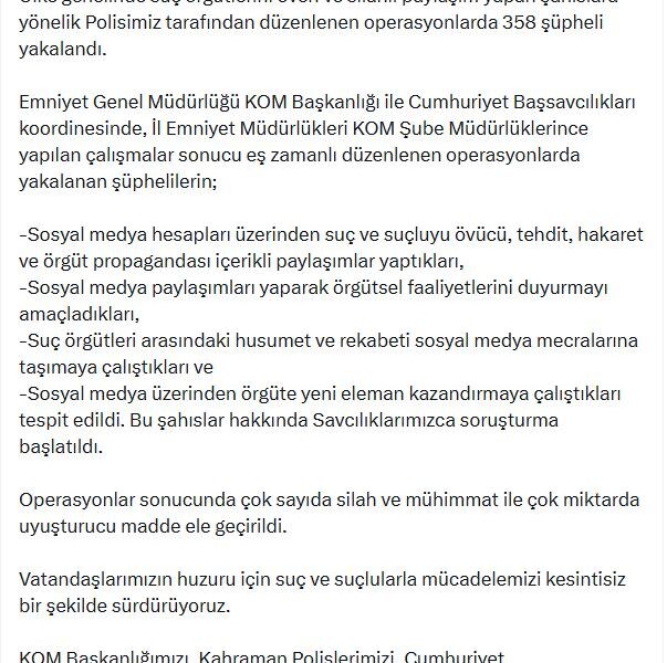 Bakanlığın sanal medya hesabından yapılan açıklamaya göre; yurt genelinde suç örgütlerini öven ve silahlı paylaşım yapanlara yönelik operasyonlarda 358 şüpheli yakalandı. Emniyet Genel Müdürlüğü KOM Başkanlığı ile Cumhuriyet başsavcılıkları koordinesinde, İl Emniyet Müdürlüğü KOM Şube müdürlükleri tarafından yapılan çalışmalar sonucu, eş zamanlı düzenlenen operasyonlarda yakalanan şüphelilerin, sanal medya hesaplarından suç ve suçluyu övücü, tehdit, hakaret ve örgüt propagandası içerikli paylaşımlar yaptıkları belirlendi. Şüphelilerin, sanal medya paylaşımları yaparak örgütsel faaliyetlerini duyurmayı amaçladıkları, suç örgütleri arasındaki husumet ve rekabeti sanal medya mecralarına taşımaya çalıştıkları ve sanal medyadan örgüte yeni eleman kazandırmaya çalıştıkları tespit edildi. Operasyonlar sonucunda çok sayıda silah ve mühimmat ile çok miktarda uyuşturucu ele geçirildi.