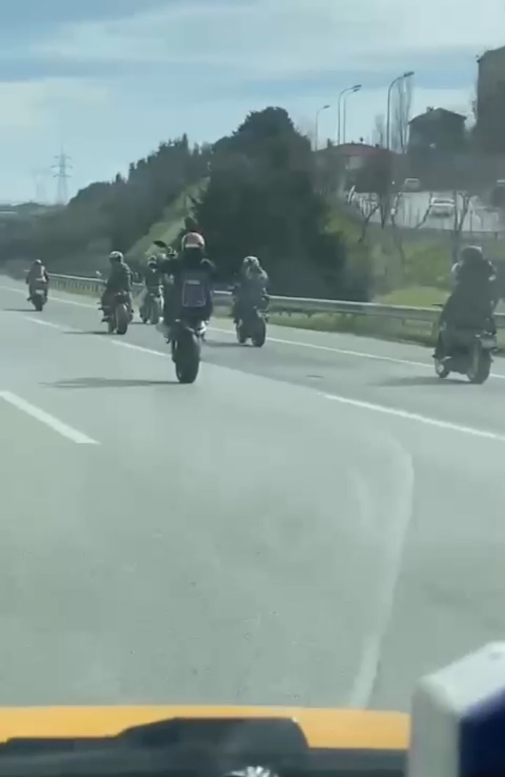 Çatalca’da, dün akşam saatlerinde ve Sultanbeyli TEM Otoyolu’nda öğle saatlerinde grup halindeki motosikletliler, bir süre tek teker üzerinde giderek hem kendilerini hem de trafiği tehlikeye düşürdü. Motosikletlerin bazılarını plakasız olduğu görüldü. Trafiği tehlikeye düşüren o anlar, cep telefonu kamerasına yansıdı.